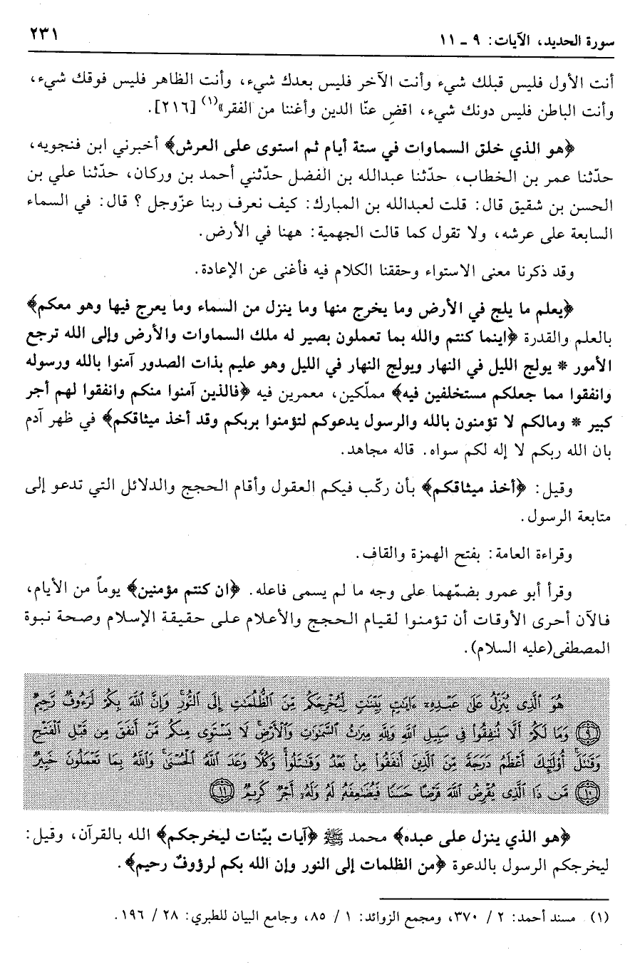 هُوَ الَّذِي خَلَقَ السَّماواتِ (وَالْأَرْضَ) فِي سِتَّةِ أَيَّامٍ ثُمَّ اسْتَوى عَلَى الْعَرْشِ أخبرني ابن فنجويه، حدّثنا عمر بن الخطاب، حدّثنا عبد الله بن الفضل حدّثني أحمد بن وركان، حدّثنا علي بن الحسن بن شقيق قال: قلت لعبد الله بن المبارك: كيف نعرف ربنا عزّ وجل؟ قال: في السماء السابعة على عرشه، ولا تقول كما قالت الجهمية: هاهنا في الأرض.