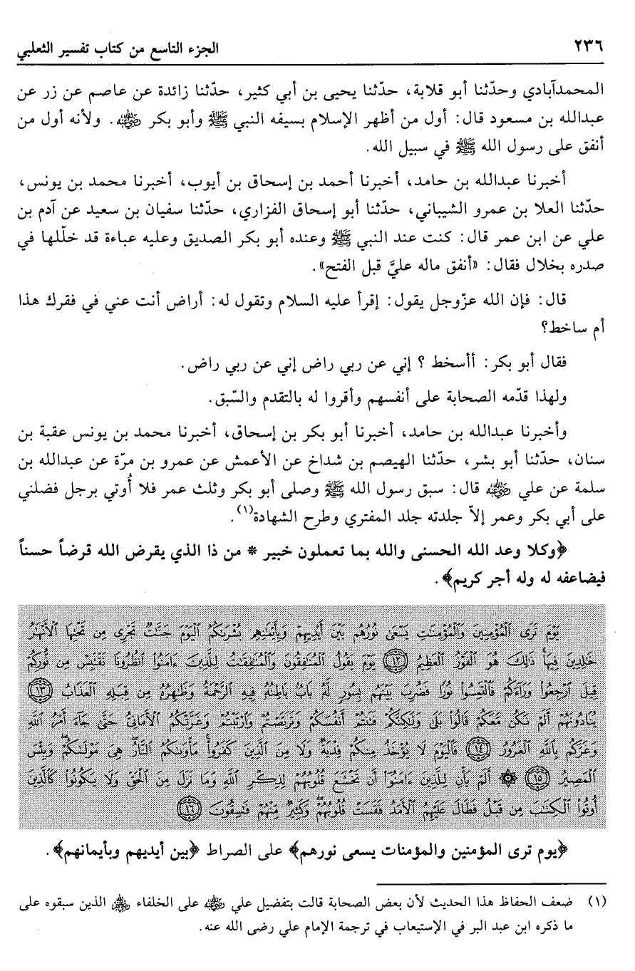 المحمدآبادي وحدّثنا أبو قلابة، حدّثنا يحيى بن أبي كثير، حدّثنا زائدة عن عاصم عن زر عن عبد الله بن مسعود قال: أول من أظهر الإسلام بسيفه النبي صلّى الله عليه وسلّم وأبو بكر رضي الله عنه. ولأنه أول من أنفق على رسول الله صلّى الله عليه وسلّم في سبيل الله.