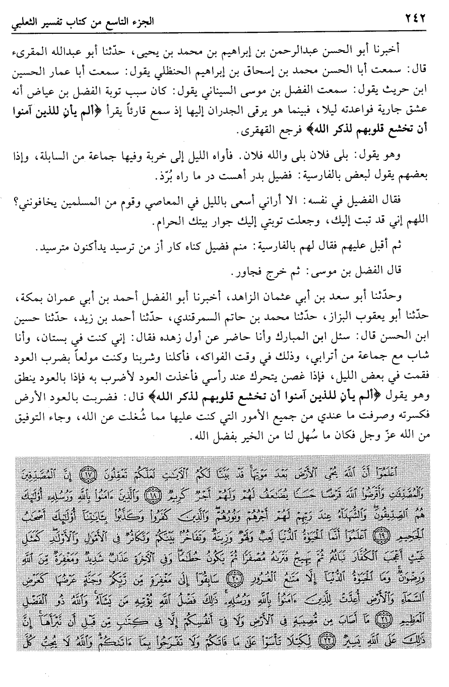 أخبرنا أبو الحسن عبد الرحمن بن إبراهيم بن محمد بن يحيى، حدّثنا أبو عبد الله المقرئ قال: سمعت أبا الحسن محمد بن إسحاق بن إبراهيم الحنظلي يقول: سمعت أبا عمار الحسين ابن حريث يقول: سمعت الفضل بن موسى السيناني يقول: كان سبب توبة الفضل بن عياض أنه عشق جارية فواعدته ليلا، فبينما هو يرقى الجدران إليها إذ سمع قارئا يقرأ أَلَمْ يَأْنِ لِلَّذِينَ آمَنُوا أَنْ تَخْشَعَ قُلُوبُهُمْ لِذِكْرِ اللَّهِ فرجع القهقرى.