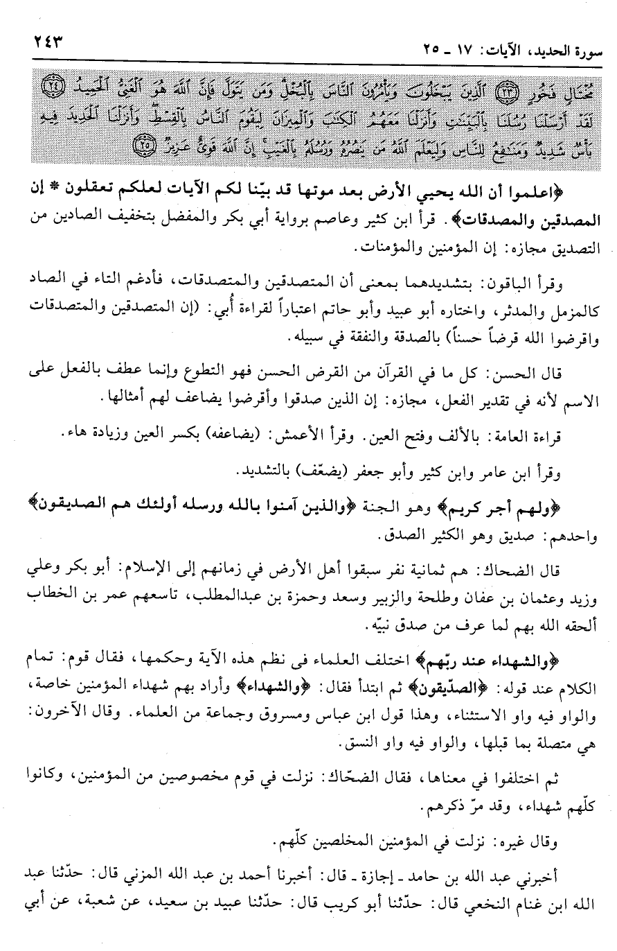 وقرأ الباقون: بتشديدهما بمعنى أن المتصدقين والمتصدقات، فأدغم التاء في الصاد كالمزمل والمدثر، واختاره أبو عبيد وأبو حاتم اعتبارا لقراءة أبي: (إن المتصدقين والمتصدقات وأقرضوا الله قرضا حسنا) بالصدقة والنفقة في سبيله.