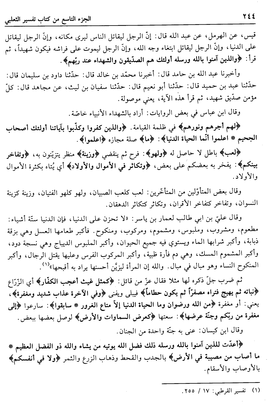 لَهُمْ أَجْرُهُمْ وَنُورُهُمْ في ظلمة القيامة. وَالَّذِينَ كَفَرُوا وَكَذَّبُوا بِآياتِنا أُولئِكَ أَصْحابُ الْجَحِيمِ اعْلَمُوا أَنَّمَا الْحَياةُ الدُّنْيا: (ما) صلة مجازه اعْلَمُوا ...