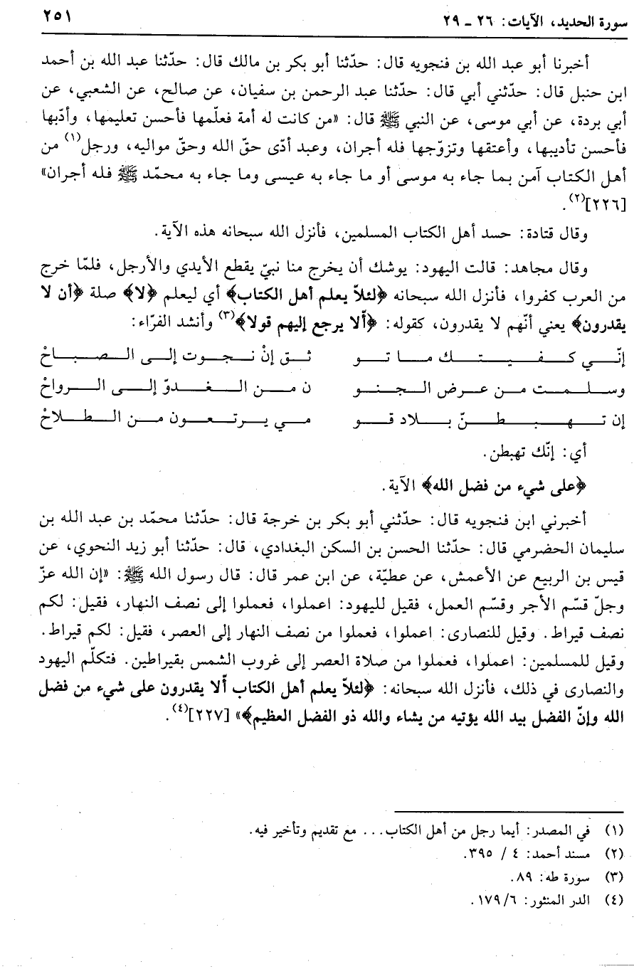 وقيل للمسلمين: اعملوا، فعملوا من صلاة العصر إلى غروب الشمس بقيراطين. فتكلّم اليهود والنصارى في ذلك، فأنزل الله سبحانه: لِئَلَّا يَعْلَمَ أَهْلُ الْكِتابِ أَلَّا يَقْدِرُونَ عَلى شَيْءٍ مِنْ فَضْلِ اللَّهِ وَأَنَّ الْفَضْلَ بِيَدِ اللَّهِ يُؤْتِيهِ مَنْ يَشاءُ وَاللَّهُ ذُو الْفَضْلِ الْعَظِيمِ» [227] «4» .