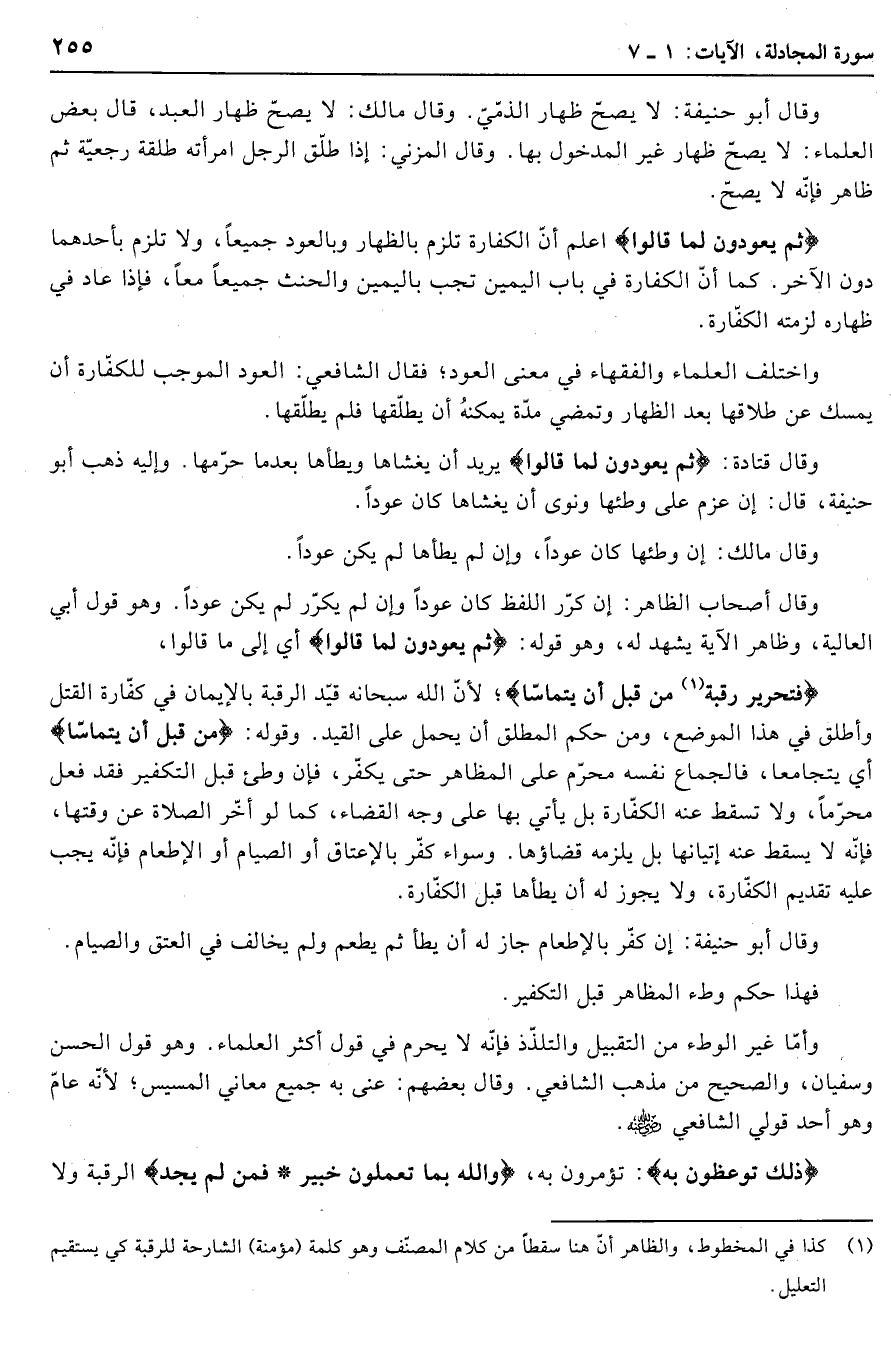 ثُمَّ يَعُودُونَ لِما قالُوا اعلم أنّ الكفارة تلزم بالظهار وبالعود جميعا، ولا تلزم بأحدهما دون الآخر. كما أنّ الكفارة في باب اليمين تجب باليمين والحنث جميعا معا، فإذا عاد في ظهاره لزمته الكفّارة.