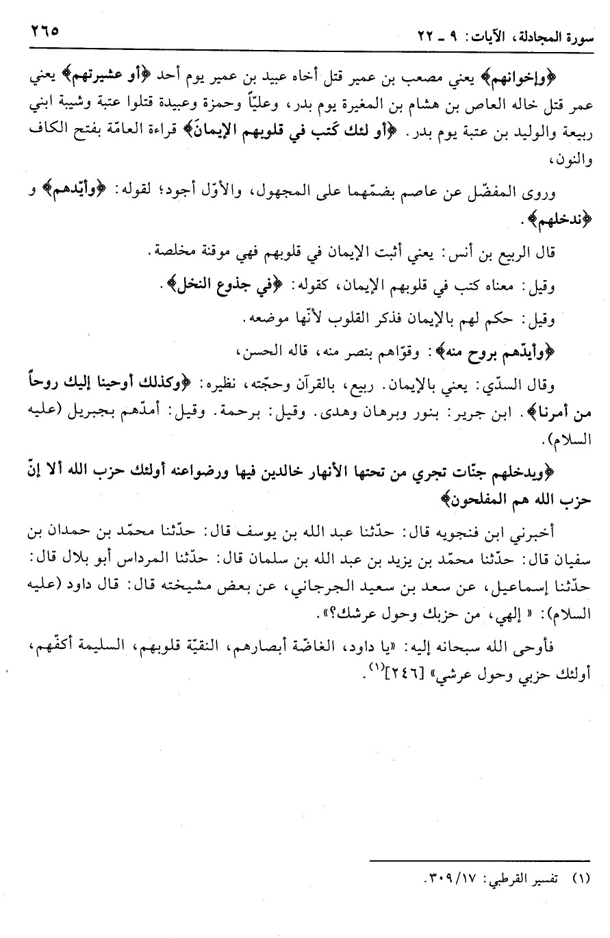وَأَيَّدَهُمْ بِرُوحٍ مِنْهُ: وقوّاهم بنصر منه، قاله الحسن، وقال السدّي: يعني بالإيمان. ربيع، بالقرآن وحجّته، نظيره: وَكَذلِكَ أَوْحَيْنا إِلَيْكَ رُوحاً مِنْ أَمْرِنا. ابن جرير: بنور وبرهان وهدى. وقيل: برحمة. وقيل: أمدّهم بجبريل (عليه السلام) .