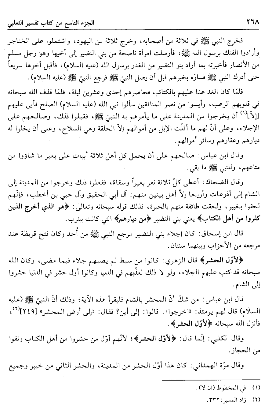 أنّ النبيّ صلّى الله عليه وسلّم (عليه السلام) قال لهم يومئذ: «اخرجوا» . قالوا: إلى أين؟ فقال: «إلى أرض المحشر» [249] «2»