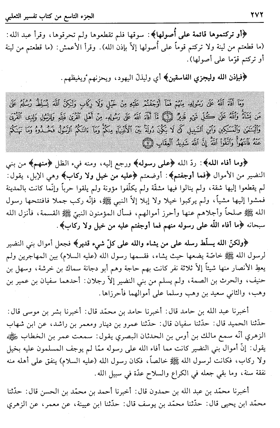 وَما أَفاءَ اللَّهُ عَلى رَسُولِهِ مِنْهُمْ فَما أَوْجَفْتُمْ عَلَيْهِ مِنْ خَيْلٍ وَلا رِكابٍ وَلكِنَّ اللَّهَ يُسَلِّطُ رُسُلَهُ عَلى مَنْ يَشاءُ وَاللَّهُ عَلى كُلِّ شَيْءٍ قَدِيرٌ (6) ما أَفاءَ اللَّهُ عَلى رَسُولِهِ مِنْ أَهْلِ الْقُرى فَلِلَّهِ وَلِلرَّسُولِ وَلِذِي الْقُرْبى وَالْيَتامى وَالْمَساكِينِ وَابْنِ السَّبِيلِ كَيْ لا يَكُونَ دُولَةً بَيْنَ الْأَغْنِياءِ مِنْكُمْ وَما آتاكُمُ الرَّسُولُ فَخُذُوهُ وَما نَهاكُمْ عَنْهُ فَانْتَهُوا وَاتَّقُوا اللَّهَ إِنَّ اللَّهَ شَدِيدُ الْعِقابِ (7)