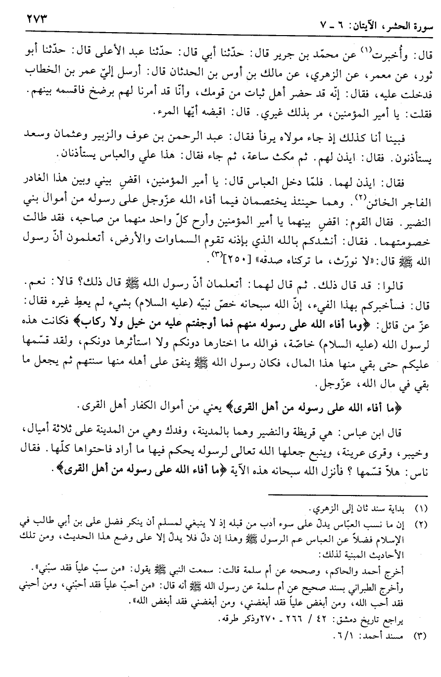 عزّ من قائل: وَما أَفاءَ اللَّهُ عَلى رَسُولِهِ مِنْهُمْ فَما أَوْجَفْتُمْ عَلَيْهِ مِنْ خَيْلٍ وَلا رِكابٍ فكانت هذه لرسول الله (عليه السلام) خاصّة، فو الله ما اختارها دونكم ولا استأثرها دونكم، ولقد قسّمها عليكم حتى بقي منها هذا المال، فكان رسول الله صلّى الله عليه وسلّم ينفق على أهله منها سنتهم ثم يجعل ما بقي في مال الله، عزّ وجل.