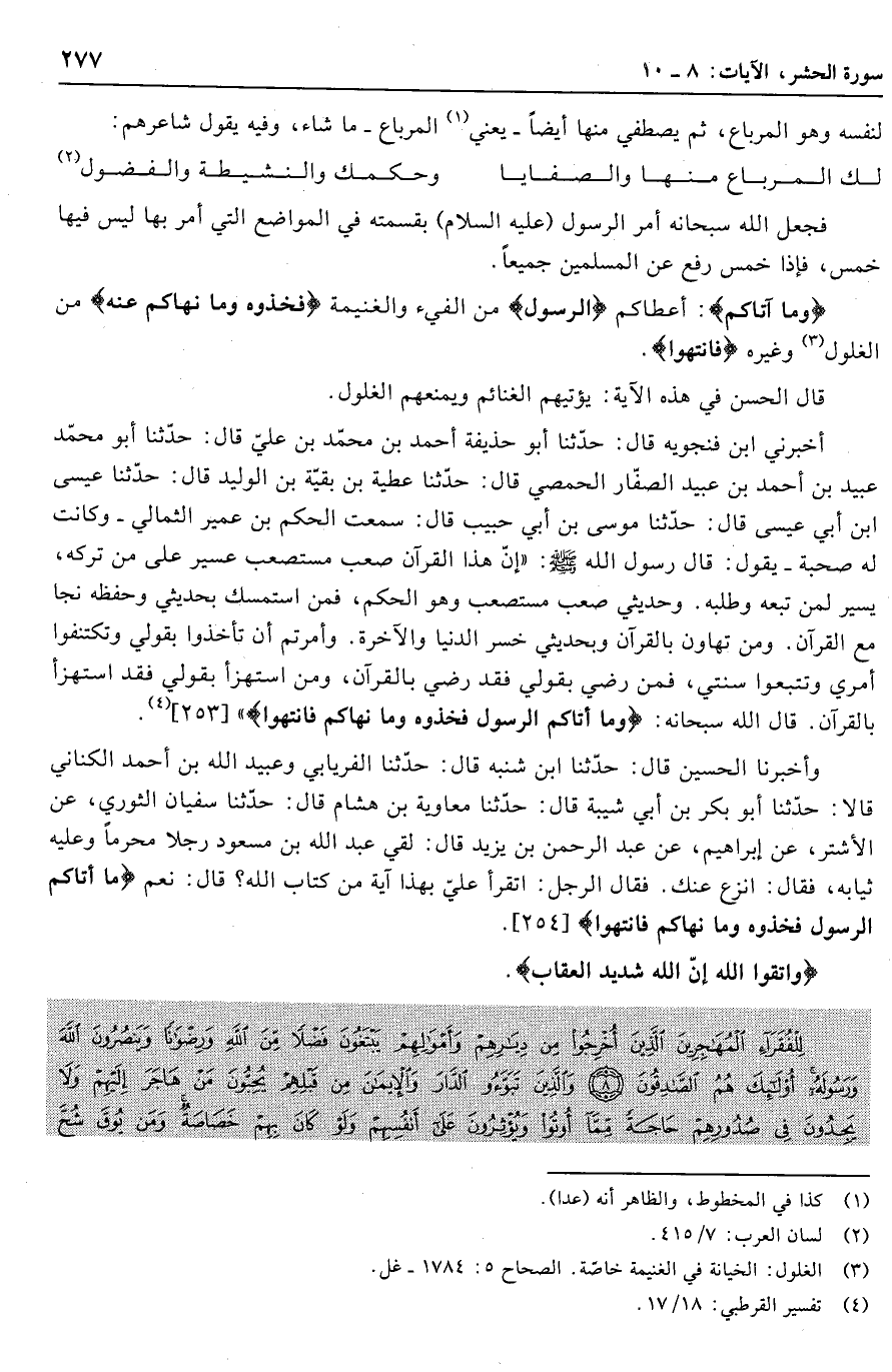 وأخبرنا الحسين قال: حدّثنا ابن شنبه قال: حدّثنا الفريابي وعبيد الله بن أحمد الكناني قالا: حدّثنا أبو بكر بن أبي شيبة قال: حدّثنا معاوية بن هشام قال: حدّثنا سفيان الثوري، عن الأشتر، عن إبراهيم، عن عبد الرحمن بن يزيد قال: لقي عبد الله بن مسعود رجلا محرما وعليه ثيابه، فقال: انزع عنك. فقال الرجل: أتقرأ عليّ بهذا آية من كتاب الله؟ قال: نعم ما آتاكُمُ الرَّسُولُ فَخُذُوهُ وَما نَهاكُمْ عَنْهُ فَانْتَهُوا [254] .