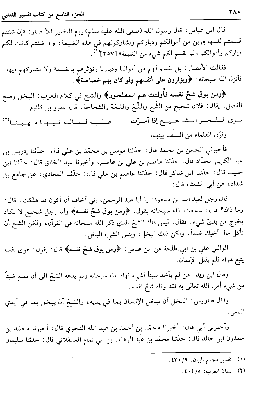 الوالبي علي بن أبي طلحة عن ابن عباس: وَمَنْ يُوقَ شُحَّ نَفْسِهِ قال: يقول: هوى نفسه يتبع هواه فلم يقبل الإيمان.