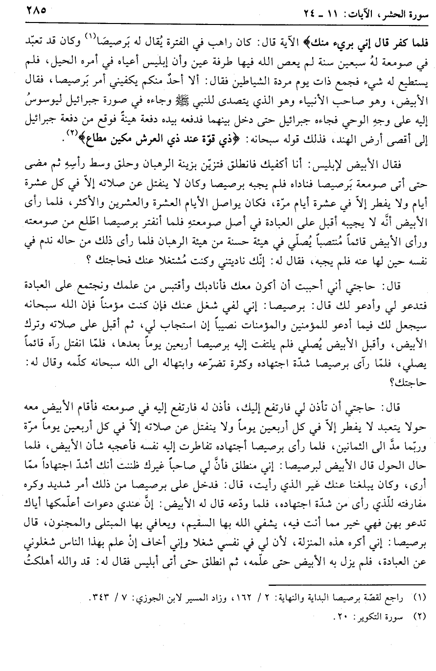 (1) راجع لقصّة برصيصا البداية والنهاية: 2/ 162، وزاد المسير لابن الجوزي: 7/ 343.