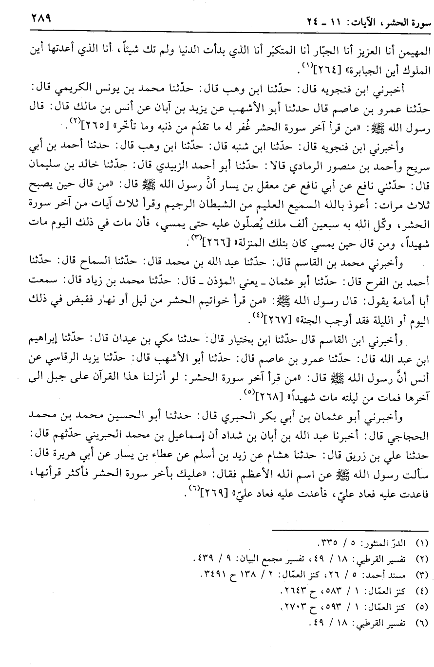 وأخبرني ابن القاسم قال حدّثنا ابن بختيار قال: حدثنا مكي بن عيدان قال: حدّثنا إبراهيم ابن عبد الله قال: حدّثنا عمرو بن عاصم قال: حدّثنا أبو الأشهب قال: حدّثنا يزيد الرقاسي عن أنس أنّ رسول الله صلّى الله عليه وسلّم قال: «من قرأ آخر سورة الحشر: لَوْ أَنْزَلْنا هذَا الْقُرْآنَ عَلى جَبَلٍ الى آخرها فمات من ليلته مات شهيدا» [268] «5» .