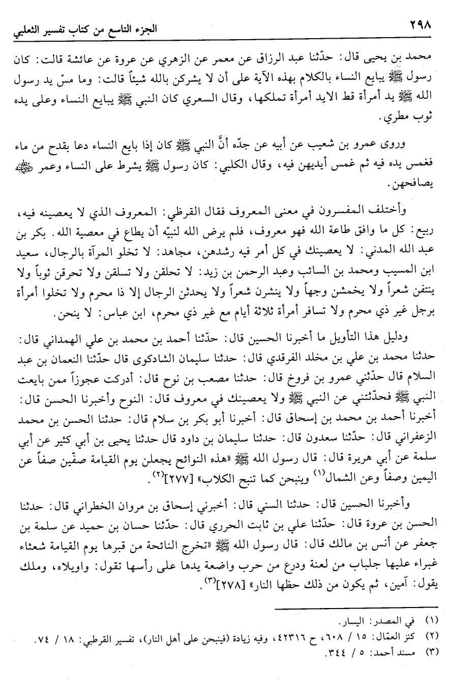 حدثنا محمد بن علي بن مخلد الفرقدي قال: حدثنا سليمان الشادكوى قال حدّثنا النعمان بن عبد السلام قال حدّثني عمرو بن فروخ قال: حدثنا مصعب بن نوح قال: أدركت عجوزا ممن بايعت النبي صلّى الله عليه وسلّم فحدّثتني عن النبي صلّى الله عليه وسلّم وَلا يَعْصِينَكَ فِي مَعْرُوفٍ قال: النوح