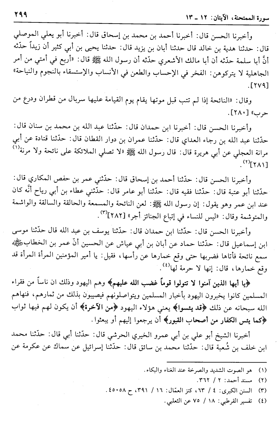 وأخبرنا الحسن قال: حدّثنا ابن حمدان قال: حدّثنا يوسف بن عبد الله قال حدّثنا موسى ابن إسماعيل قال: حدّثنا حماد عن أبان بن أبي عياش عن الحسين أنّ عمر بن الخطاب رضي الله عنه سمع نائحة فأتاها فضربها حتى وقع خمارها عن رأسها، فقيل: يا أمير المؤمنين المرأة المرأة قد وقع خمارها، قال: إنها لا حرمة لها «4» .