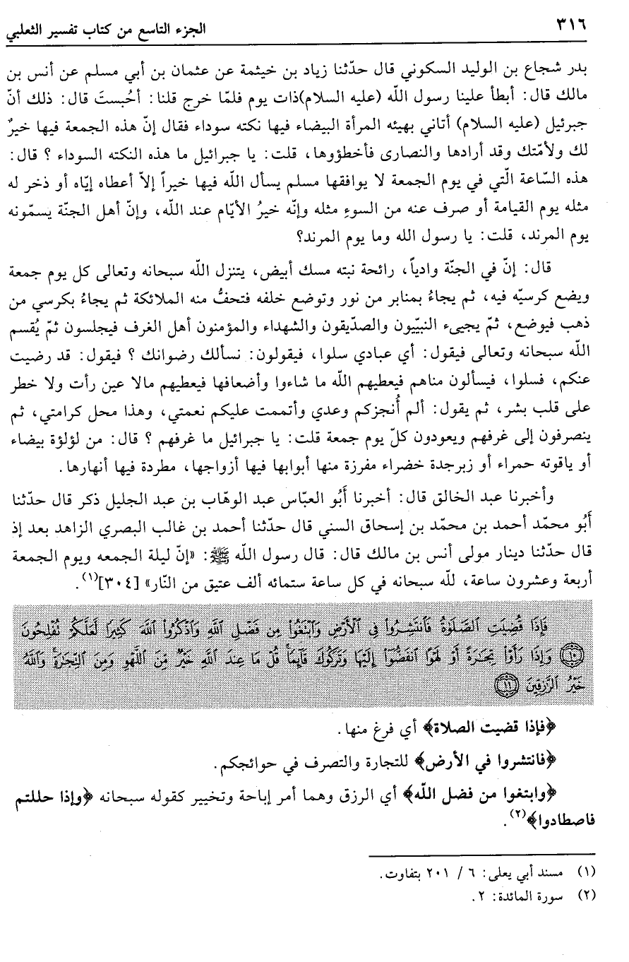 بدر شجاع بن الوليد السكوني قال حدّثنا زياد بن خيثمة عن عثمان بن أبي مسلم عن أنس بن مالك قال: أبطأ علينا رسول الله (عليه السلام) ذات يوم فلمّا خرج قلنا: أحبست قال: ذلك أنّ جبرئيل (عليه السلام) أتاني بهيئة المرأة البيضاء فيها نكتة سوداء فقال إنّ هذه الجمعة فيها خير لك ولأمّتك وقد أرادها والنصارى فأخطئوها، قلت: يا جبرائيل ما هذه النكتة السوداء؟ قال: