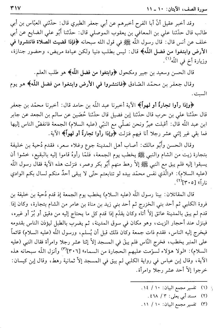 أخبرنا عبد الله بن حامد قال: أخبرنا محمّد بن جعفر قال حدّثنا علي بن حرب قال حدّثنا ابن فضيل قال حدّثنا حصين عن سالم بن الجعد عن جابر ابن عبد الله قال: أقبلت عير ونحن نصلّي مع النبيّ (عليه السلام) الجمعة فانفضّ الناس إليها فما بقي غير اثني عشر رجلا أنا فيهم فنزلت وَإِذا رَأَوْا تِجارَةً أَوْ لَهْواً الآية.