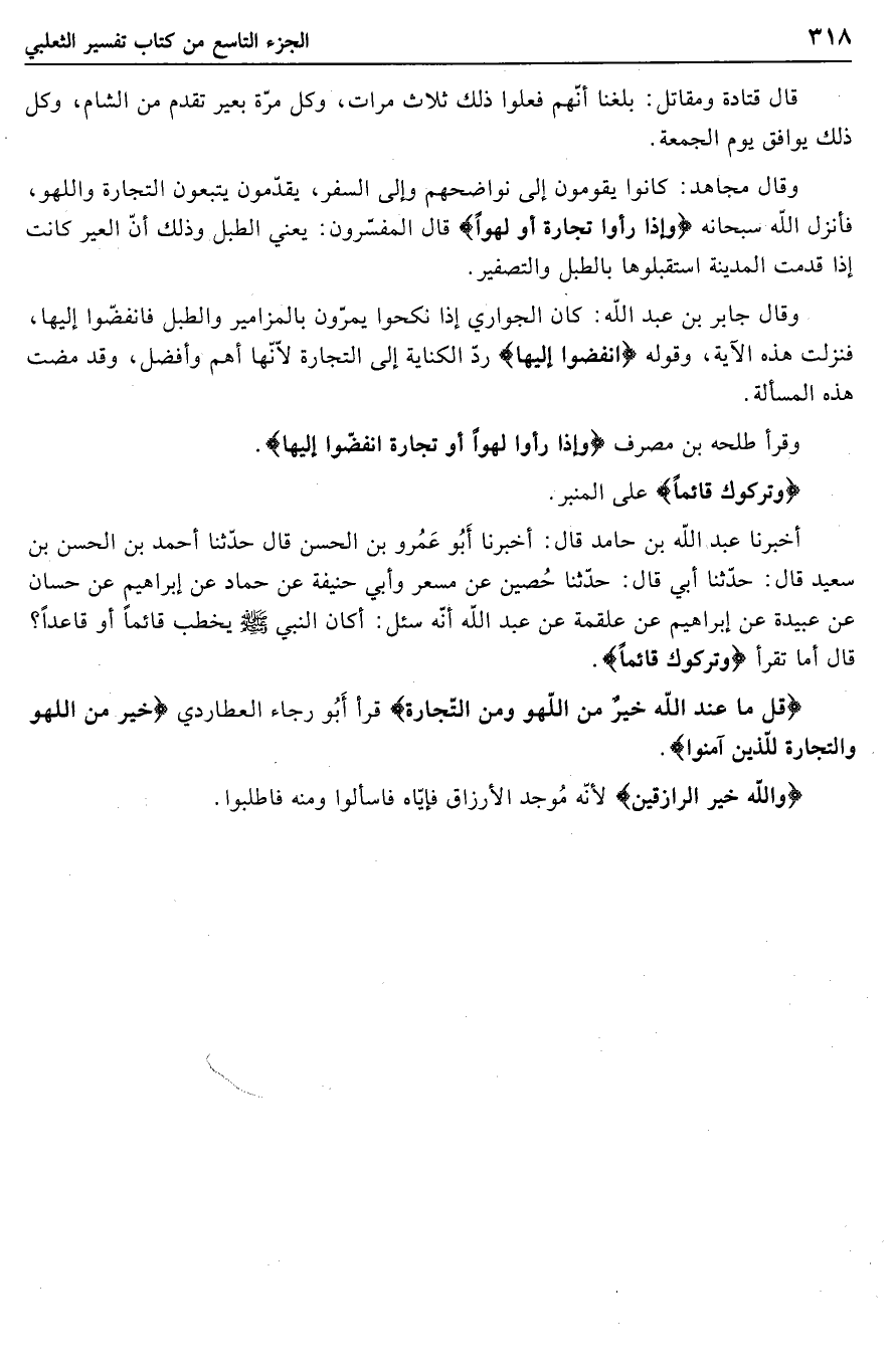 وقال مجاهد: كانوا يقومون إلى نواضحهم وإلى السفر، يقدّمون يتبعون التجارة واللهو، فأنزل الله سبحانه وَإِذا رَأَوْا تِجارَةً أَوْ لَهْواً قال المفسّرون: يعني الطبل وذلك أنّ العير كانت إذا قدمت المدينة استقبلوها بالطبل والتصفير.
