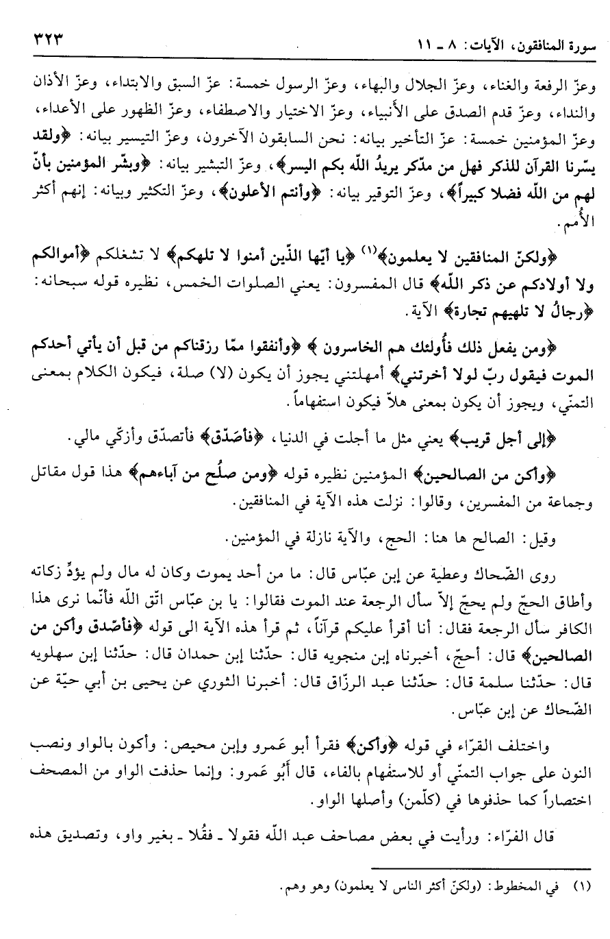 وَأَكُنْ مِنَ الصَّالِحِينَ المؤمنين نظيره قوله وَمَنْ صَلَحَ مِنْ آبائِهِمْ هذا قول مقاتل وجماعة من المفسرين، وقالوا: نزلت هذه الآية في المنافقين.
