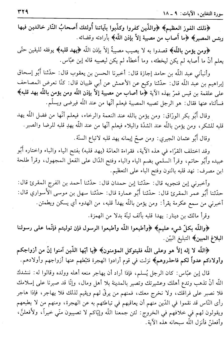 وأنبأني عبد الله بن حامد إجازة قال: أخبرنا الحسن بن يعقوب قال: حدّثنا أبو إسحاق إبراهيم بن عبد الله قال: حدّثنا وكيع عن الأعمش عن أبي ظبيان قال: كنّا نعرض المصاحف على علقمة بن قيس فمرّ بهذه الآية ما أَصابَ مِنْ مُصِيبَةٍ إِلَّا بِإِذْنِ اللَّهِ وَمَنْ يُؤْمِنْ بِاللَّهِ يَهْدِ قَلْبَهُ فسألناه عنها فقال: هو الرجل تصيبه المصيبة فيعلم أنّها من عند الله فيرضى ويسلّم.