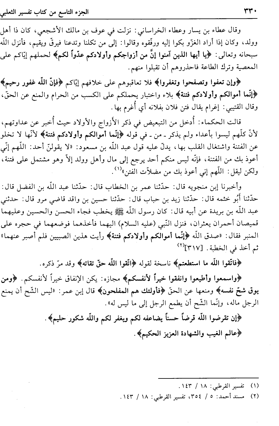 حدّثنا أبو خثمه قال: حدّثنا زيد بن حباب قال: حدّثنا حسين بن واقد قاضي مرو قال: حدثني عبد الله بن بريدة عن أبيه قال: كان رسول الله صلّى الله عليه وسلّم يخطب فجاء الحسن والحسين وعليهما قميصان أحمران يعثران، فنزل النّبي (عليه السلام) إليهما فأخذهما فوضعهما في حجره على المنبر فقال: «صدق الله نَّما أَمْوالُكُمْ وَأَوْلادُكُمْ فِتْنَةٌ