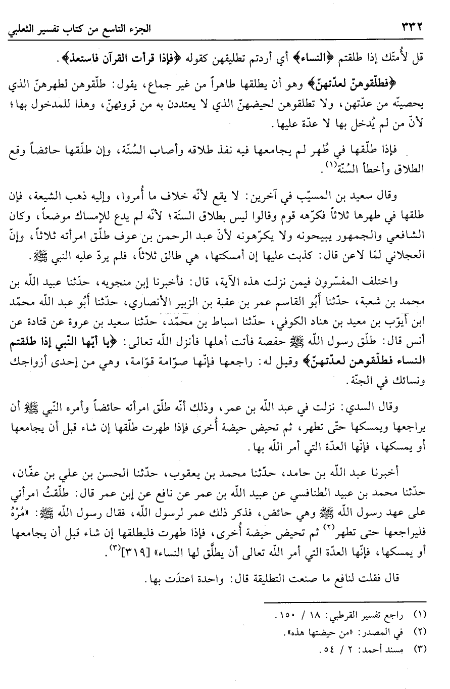 أخبرنا عبد الله بن حامد، حدّثنا محمد بن يعقوب، حدّثنا الحسن بن علي بن عفّان، حدّثنا محمد بن عبيد الطنافسي عن عبيد الله بن عمر عن نافع عن ابن عمر قال: طلّقت امرأتي على عهد رسول الله صلّى الله عليه وسلّم وهي حائض، فذكر ذلك عمر لرسول الله، فقال رسول الله صلّى الله عليه وسلّم: «مره فليراجعها حتى تطهر «2» ثم تحيض حيضة أخرى، فإذا طهرت فليطلقها إن شاء قبل أن يجامعها أو يمسكها، فإنّها العدّة التي أمر الله تعالى أن يطلّق لها النساء» [319] «3» .