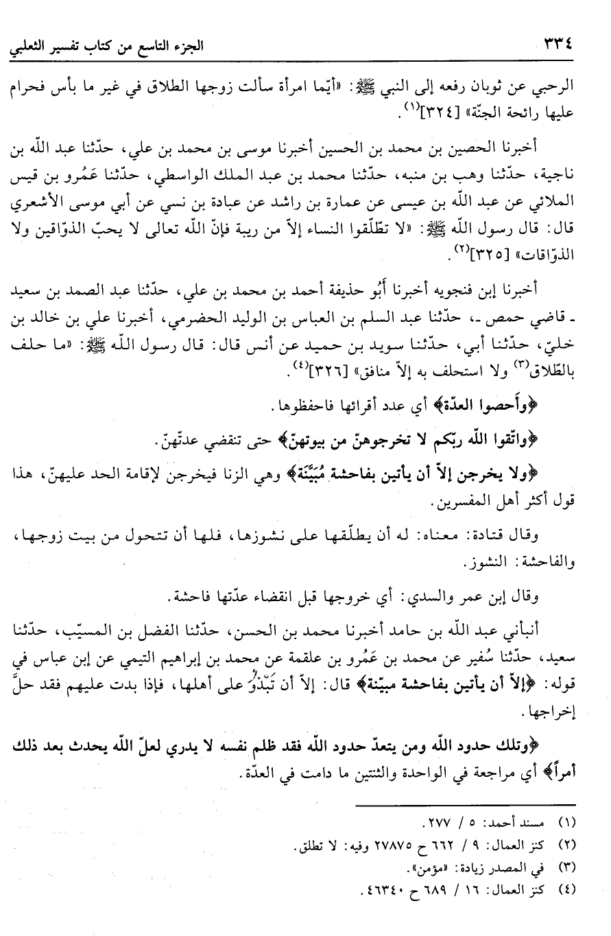 أنبأني عبد الله بن حامد أخبرنا محمد بن الحسن، حدّثنا الفضل بن المسيّب، حدّثنا سعيد، حدّثنا سفير عن محمد بن عمرو بن علقمة عن محمد بن إبراهيم التيمي عن ابن عباس في قوله: إِلَّا أَنْ يَأْتِينَ بِفاحِشَةٍ مُبَيِّنَةٍ قال: إلّا أن تبدو على أهلها، فإذا بدت عليهم فقد حلّ إخراجها.
