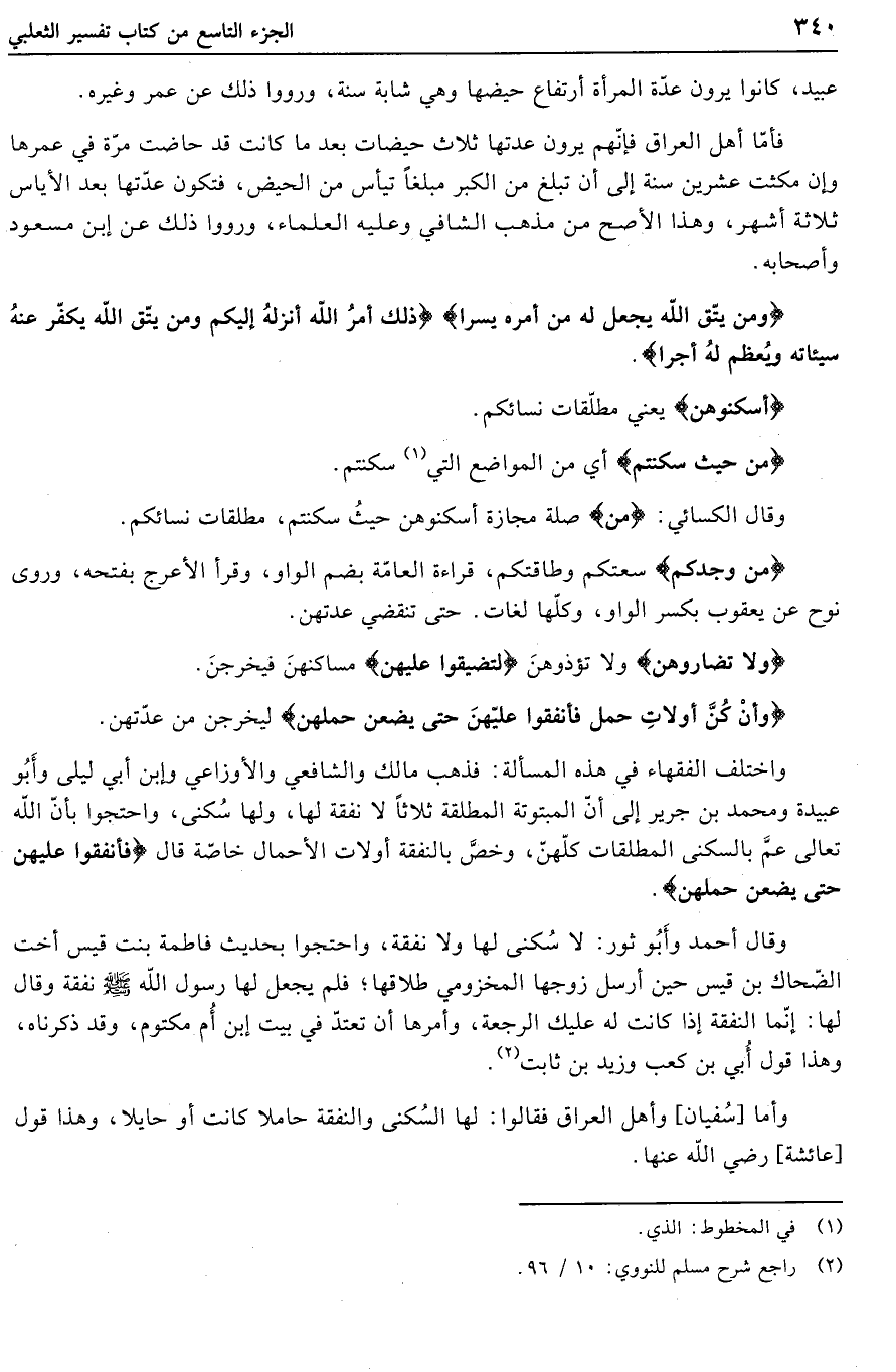 واختلف الفقهاء في هذه المسألة: فذهب مالك والشافعي والأوزاعي وابن أبي ليلى وأبو عبيدة ومحمد بن جرير إلى أنّ المبتوتة المطلقة ثلاثا لا نفقة لها، ولها سكنى، واحتجوا بأنّ الله تعالى عمّ بالسكنى المطلقات كلّهنّ، وخصّ بالنفقة أولات الأحمال خاصّة قال فَأَنْفِقُوا عَلَيْهِنَّ حَتَّى يَضَعْنَ حَمْلَهُنَّ.