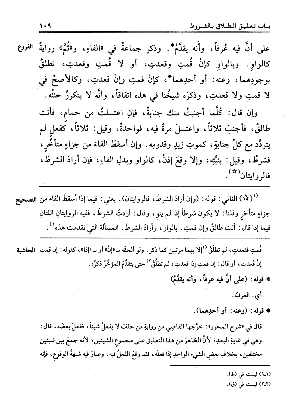 عَلَى أَنَّ فِيهِ عُرْفًا، وَأَنَّهُ يُقَدَّمُ، وَذَكَرَ جَمَاعَةٌ فِي الْفَاءِ وَثُمَّ رِوَايَةً كَالْوَاوِ، وَبِالْوَاوِ كَإِنْ قُمْت وَقَعَدْت أَوْ لَا قُمْت وَقَعَدْت تَطْلُقُ بِوُجُودِهِمَا، وَعَنْهُ: أَوْ أَحَدُهُمَا، كَإِنْ قُمْت وَإِنْ قَعَدْت، وَكَالْأَصَحِّ، فِي لَا قُمْت وَلَا قَعَدْت، وَذَكَرَهُ شَيْخُنَا فِي هَذِهِ اتِّفَاقًا، وَأَنَّهُ لَا يَتَكَرَّرُ حِنْثُهُ، وَإِنْ قَالَ: كُلَّمَا أَجْنَبْت مِنْك جَنَابَةً فَإِنْ اغْتَسَلْت مِنْ حَمَّامٍ فَأَنْتِ طَالِقٌ فَأَجْنَبَ ثَلَاثًا وَاغْتَسَلَ مَرَّةً فِيهِ فَوَاحِدَةٌ، وَقِيلَ: ثَلَاثًا، كَفِعْلٍ لَمْ يَتَرَدَّدْ مَعَ كُلِّ جَنَابَةٍ، كَمَوْتِ زَيْدٍ وَقُدُومِهِ، وَإِنْ أَسْقَطَ الْفَاءَ مِنْ جَزَاءٍ مُتَأَخِّرٍ فَشَرْطٌ، وَقِيلَ: بِنِيَّتِهِ، وَإِلَّا وَقَعَ إذَنْ، كَالْوَاوِ بَدَلَ الْفَاءِ، فَإِنْ أَرَادَ الشرط فالروايتان.