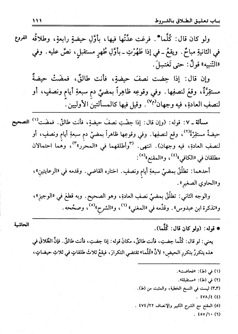 ـــــــــــــــــــــــــــــQمَسْأَلَةٌ 7: قَوْلُهُ: وَإِنْ قَالَ: إذَا حِضْت نِصْفَ حَيْضَةٍ فَأَنْتِ طَالِقٌ، فَمَضَتْ1 حَيْضَةٌ مُسْتَقِرَّةٌ2 وَقَعَ لِنِصْفِهَا، وَفِي وُقُوعِهَا ظَاهِرًا بِمُضِيِّ دَمِ سَبْعَةِ أَيَّامٍ وَنِصْفٍ أَوْ لِنِصْفِ الْعَادَةِ فِيهِ وَجْهَانِ، انْتَهَى. وَأَطْلَقَهُمَا فِي الْمُحَرَّرِ3 هُمَا احْتِمَالَانِ مُطْلَقَانِ فِي الْكَافِي4 وَالْمُقْنِعِ5.