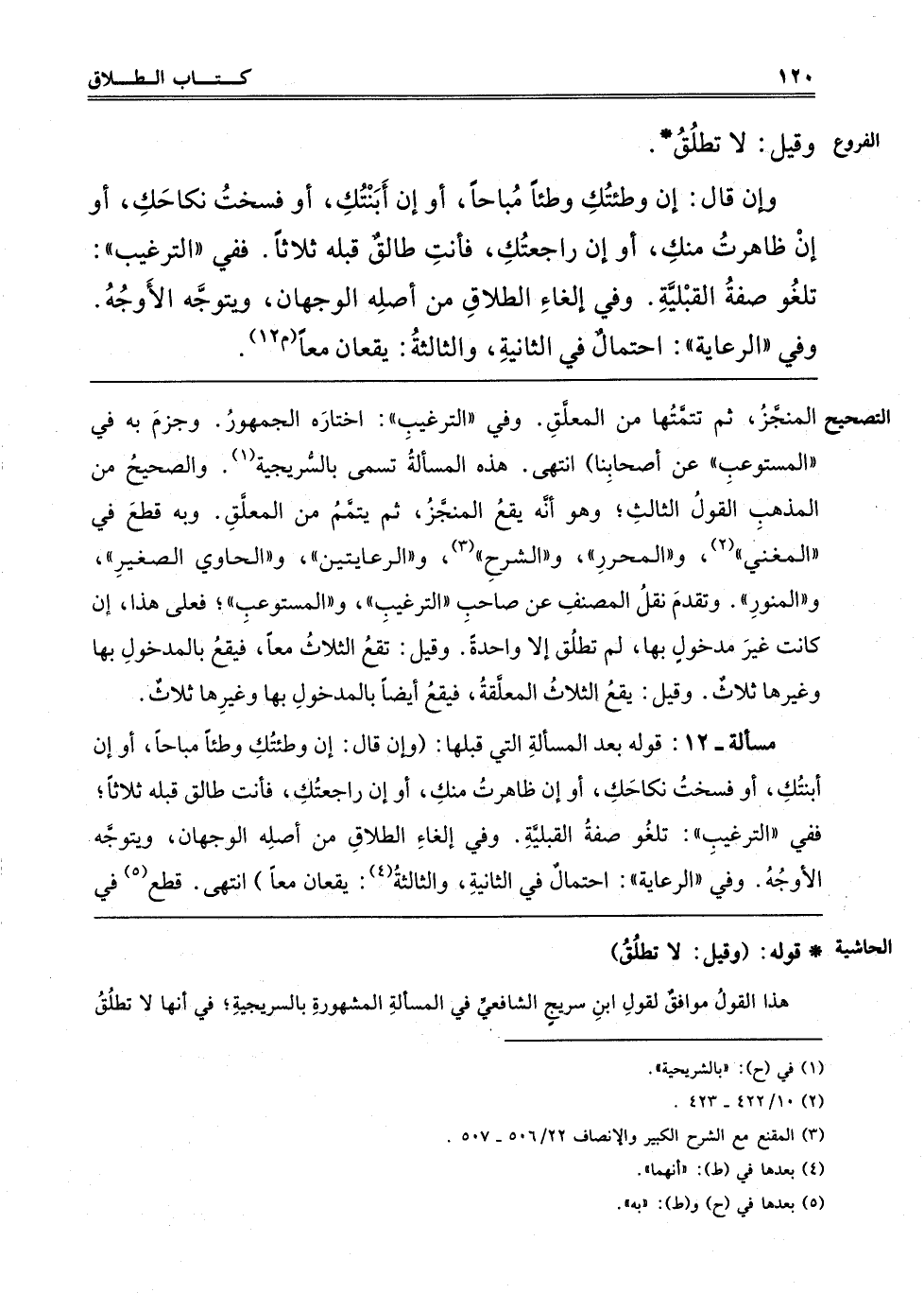 مَسْأَلَةٌ 12: قَوْلُهُ: بَعْدَ الْمَسْأَلَةِ الَّتِي قَبْلَهَا: وَإِنْ قَالَ: إنْ وَطِئْتُك وَطْئًا مُبَاحًا أَوْ إنْ أَبَنْتُك أَوْ فَسَخْت نِكَاحَك أَوْ إنْ ظَاهَرْت مِنْك أَوْ إنْ رَاجَعْتُك فَأَنْتِ طَالِقٌ قَبْلَهُ ثَلَاثًا، فَفِي التَّرْغِيبِ تَلْغُو صِفَةُ الْقَبْلِيَّةِ وَفِي إلْغَاءِ الطَّلَاقِ مِنْ أَصْلِهِ الْوَجْهَانِ، وَيَتَوَجَّهُ الْأَوْجَهُ. وَفِي الرِّعَايَةِ احْتِمَالٌ فِي الثَّانِيَةِ وَالثَّالِثَةِ4 أَنَّهُمَا يقعان معا انتهى. قطع5 به في