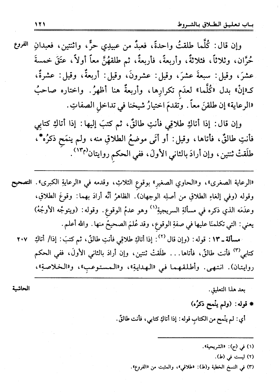 ـــــــــــــــــــــــــــــQالرِّعَايَةِ الصُّغْرَى وَالْحَاوِي الصَّغِيرِ بِوُقُوعِ الثَّلَاثِ، وَقَدَّمَهُ فِي الرِّعَايَةِ الْكُبْرَى، وَقَوْلُهُ وَفِي إلْغَاءِ الطَّلَاقِ مِنْ أَصْلِهِ الْوَجْهَانِ الظَّاهِرُ أَنَّهُ أَرَادَ بِهِمَا وُقُوعَ الطَّلَاقِ وَعَدَمَهُ الَّذِي ذَكَرَهُ فِي مَسْأَلَةِ السُّرَيْجِيَّةِ1، وَهُوَ عَدَمُ الْوُقُوعِ، وَقَوْلُهُ: وَيَتَوَجَّهُ الْأَوْجَهُ يَعْنِي الَّتِي تَكَلَّمْنَا عَلَيْهَا فِي صِفَةِ الْوُقُوعِ، وقد علم الصحيح منها. والله أعلم.