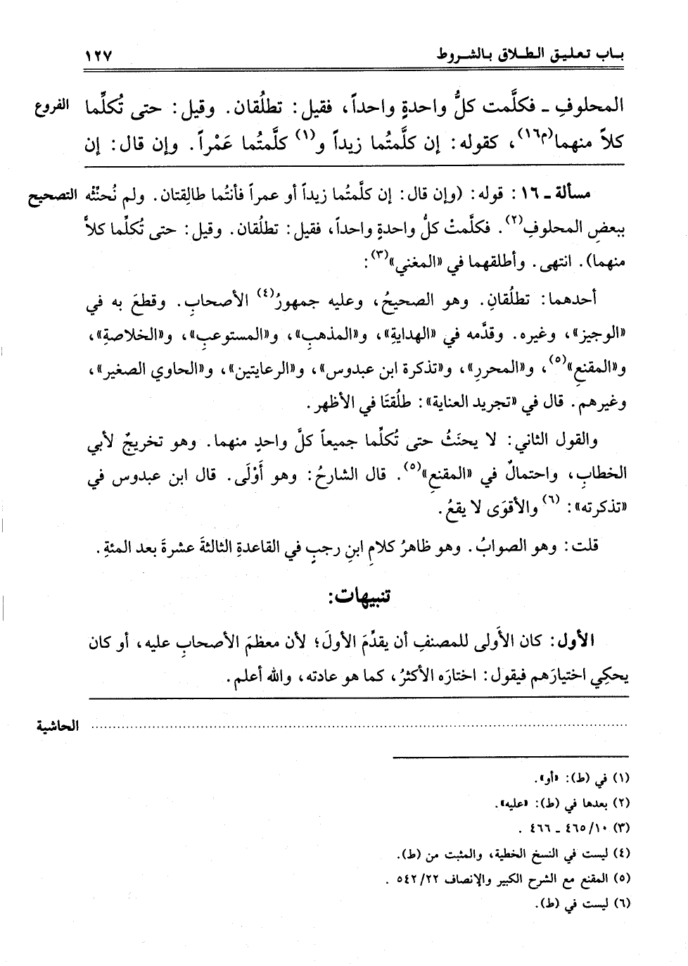 ـــــــــــــــــــــــــــــQمَسْأَلَةٌ 16: قَوْلُهُ: وَإِنْ قَالَ: إنْ كَلَّمْتُمَا زَيْدًا أَوْ عَمْرًا فَأَنْتُمَا طَالِقَتَانِ وَلَمْ نُحْنِثْهُ بِبَعْضِ الْمَحْلُوفِ2 فَكَلَّمَتْ كُلُّ وَاحِدَةٍ وَاحِدًا، فَقِيلَ: تَطْلُقَانِ، وَقِيلَ: حَتَّى يُكَلِّمَا كُلًّا مِنْهُمَا، انْتَهَى. وَأَطْلَقَهُمَا فِي الْمُغْنِي3.