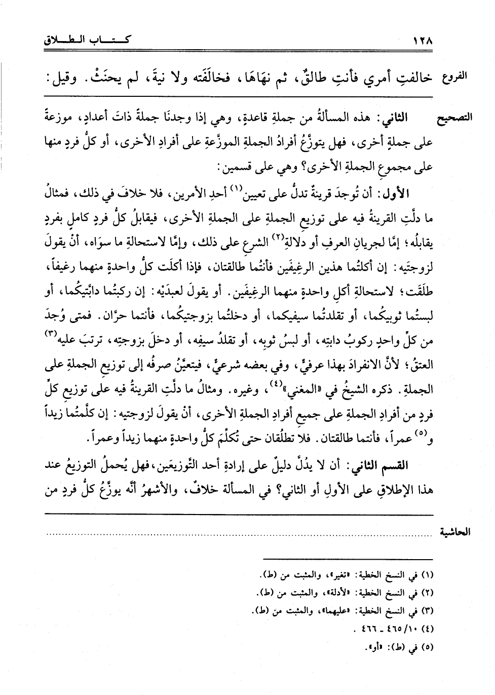 الْأَوَّلُ: أَنْ تُوجَدَ قَرِينَةٌ تَدُلُّ عَلَى تَعْيِينِ1 أَحَدِ الْأَمْرَيْنِ، فَلَا خِلَافَ فِي ذَلِكَ، فَمِثَالُ مَا دَلَّتْ الْقَرِينَةُ فِيهِ عَلَى تَوْزِيعِ الْجُمْلَةِ عَلَى الْجُمْلَةِ الْأُخْرَى فَيُقَابَلُ كُلُّ فَرْدٍ كَامِلٍ بِفَرْدٍ يُقَابِلُهُ، إمَّا لِجَرَيَانِ الْعُرْفِ أَوْ دَلَالَةِ2 الشَّرْعِ عَلَى ذَلِكَ وَإِمَّا لِاسْتِحَالَةِ مَا سِوَاهُ أَنْ يَقُولَ لِزَوْجَتَيْهِ: إنْ أَكَلْتُمَا هَذَيْنِ الرَّغِيفَيْنِ فَأَنْتُمَا طَالِقَتَانِ، فَإِذَا أَكَلَتْ كُلُّ وَاحِدَةٍ مِنْهُمَا رَغِيفًا طَلُقَتْ لِاسْتِحَالَةِ أَكْلِ وَاحِدَةٍ مِنْهُمَا الرَّغِيفَيْنِ. أَوْ يَقُولُ لِعَبْدَيْهِ: إنْ رَكِبْتُمَا دَابَّتَيْكُمَا أَوْ لَبِسْتُمَا ثَوْبَيْكُمَا أَوْ تَقَلَّدْتُمَا سَيْفَيْكُمَا أَوْ دَخَلْتُمَا بِزَوْجَتَيْكُمَا فَأَنْتُمَا حُرَّانِ، فَمَتَى وَجَدَ مِنْ كُلِّ وَاحِدٍ رُكُوبَ دَابَّتِهِ أَوْ لُبْسَ ثَوْبِهِ أَوْ تَقَلُّدَ سَيْفِهِ أَوْ دَخَلَ بِزَوْجَتِهِ تَرَتَّبَ عَلَيْهِ3 الْعِتْقُ، لِأَنَّ الِانْفِرَادَ بِهَذَا عُرْفِيٌّ، وَفِي بَعْضِهِ شَرْعِيٌّ، فَيَتَعَيَّنُ صَرْفُهُ إلَى تَوْزِيعِ الْجُمْلَةِ عَلَى الْجُمْلَةِ، ذَكَرَهُ الشَّيْخُ فِي الْمُغْنِي4 وَغَيْرِهِ، وَمِثَالُ مَا دَلَّتْ الْقَرِينَةُ فِيهِ عَلَى تَوْزِيعِ كُلِّ فَرْدٍ مِنْ أَفْرَادِ الْجُمْلَةِ عَلَى جَمِيعِ أَفْرَادِ الْجُمْلَةِ الْأُخْرَى أَنْ يَقُولَ لِزَوْجَتَيْهِ: إنْ كَلَّمْتُمَا زيدا و5 عَمْرًا فَأَنْتُمَا طَالِقَتَانِ، فَلَا تَطْلُقَانِ حَتَّى تُكَلِّمَ كُلُّ وَاحِدَةٍ مِنْهُمَا زَيْدًا وَعَمْرًا.