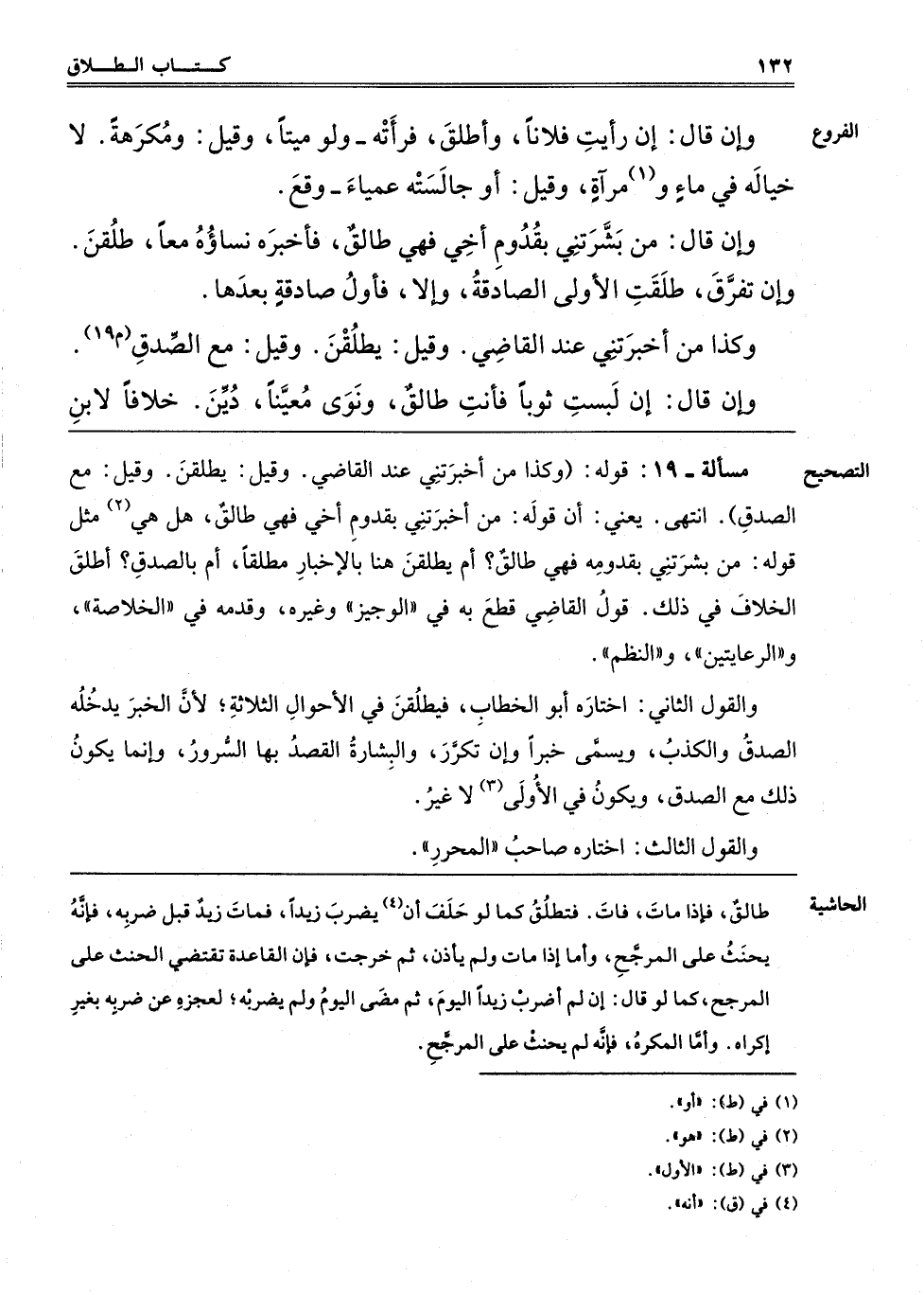 ـــــــــــــــــــــــــــــQمَسْأَلَةٌ 19: قَوْلُهُ: وَكَذَا مَنْ أَخْبَرَتْنِي عِنْدَ الْقَاضِي، وَقِيلَ: يُطَلَّقْنَ، وَقِيلَ: مَعَ الصِّدْقِ، انْتَهَى. يَعْنِي أَنَّ قَوْلَهُ مَنْ أَخْبَرَتْنِي بِقُدُومِ أَخِي فَهِيَ طالق هل هي2 مِثْلُ قَوْلِهِ مَنْ بَشَّرَتْنِي بِقُدُومِهِ فَهِيَ طَالِقٌ؟ أَمْ يُطَلَّقْنَ هُنَا بِالْإِخْبَارِ مُطْلَقًا أَمْ بِالصِّدْقِ؟ أَطْلَقَ الْخِلَافَ فِي ذَلِكَ. قَوْلُ الْقَاضِي قَطَعَ بِهِ فِي الْوَجِيزِ وَغَيْرِهِ، وَقَدَّمَهُ فِي الْخُلَاصَةِ وَالرِّعَايَتَيْنِ وَالنَّظْمِ.