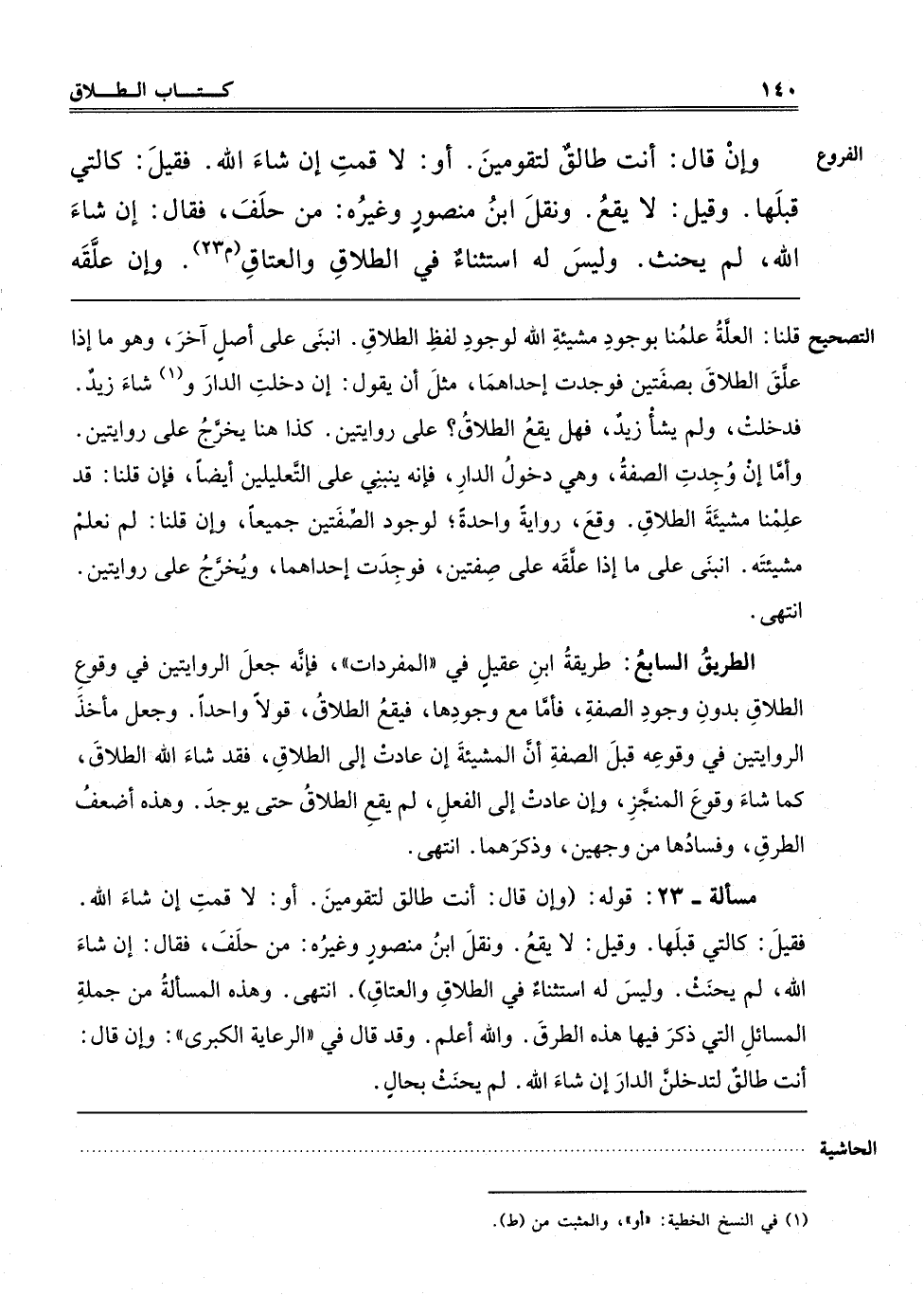 مَسْأَلَةٌ 23: قَوْلُهُ: وَإِنْ قَالَ: أَنْتِ طَالِقٌ لَتَقُومِينَ أَوْ لَا قُمْت إنْ شَاءَ اللَّهُ فَقِيلَ: كَالَّتِي قَبْلَهَا، وَقِيلَ: لَا يَقَعُ، وَنَقَلَ ابْنُ مَنْصُورٍ وَغَيْرُهُ: مَنْ حَلَفَ فَقَالَ: إنْ شَاءَ اللَّهُ لَمْ يَحْنَثْ، وَلَيْسَ لَهُ اسْتِثْنَاءٌ فِي الطَّلَاقِ وَالْعَتَاقِ، انْتَهَى. وَهَذِهِ الْمَسْأَلَةُ مِنْ جُمْلَةِ الْمَسَائِلِ الَّتِي ذَكَرَ فِيهَا هَذِهِ الطُّرُقَ، وَاَللَّهُ أَعْلَمُ، وَقَدْ قَالَ فِي الرِّعَايَةِ الْكُبْرَى. وَإِنْ قَالَ: أَنْتِ طَالِقٌ لَتَدْخُلِنَّ الدَّارَ إنْ شَاءَ اللَّهُ لَمْ يحنث بحال.