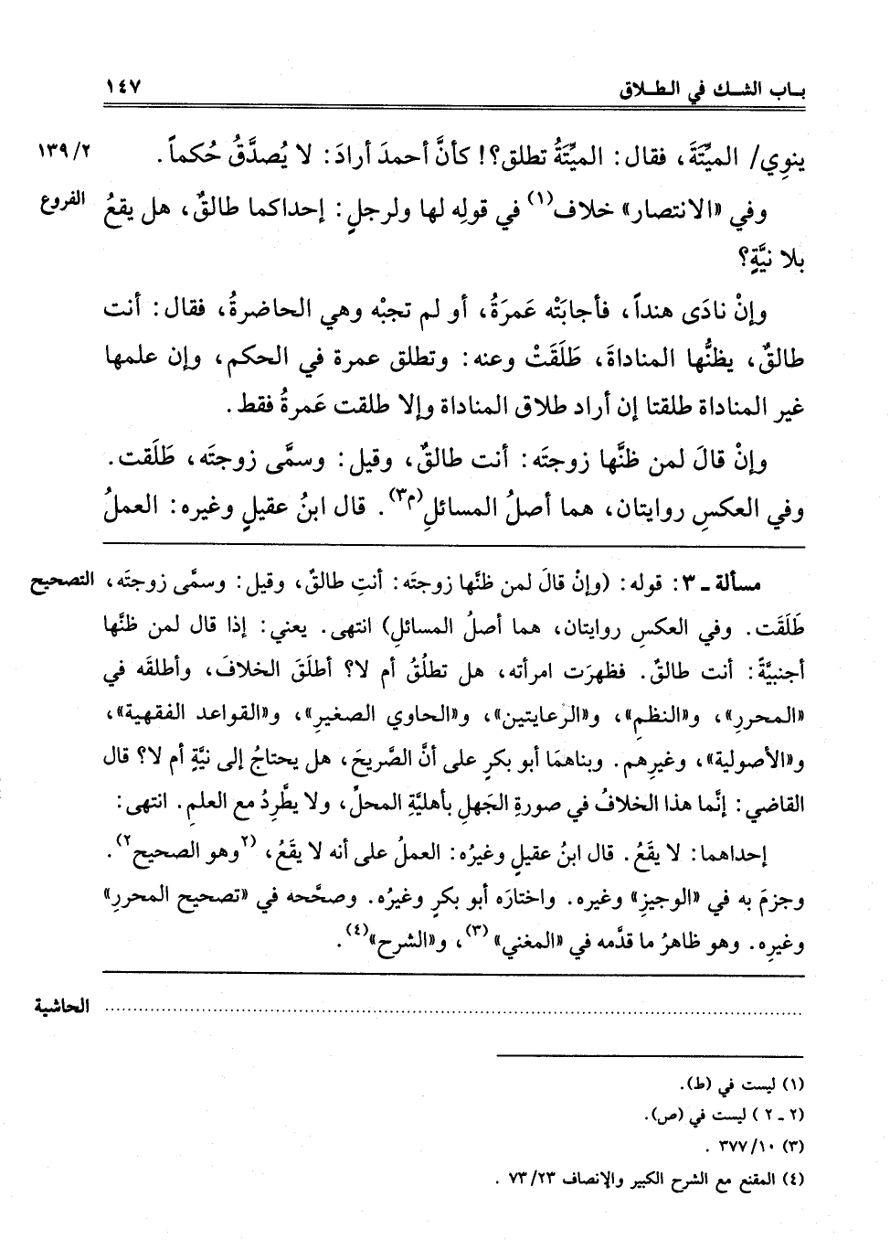 ـــــــــــــــــــــــــــــQمَسْأَلَةٌ 3: قَوْلُهُ: وَإِنْ قَالَ: لِمَنْ ظَنَّهَا زَوْجَتَهُ أَنْتِ طَالِقٌ، وَقِيلَ: وَسَمَّى زَوْجَتَهُ، طَلُقَتْ، وَفِي الْعَكْسِ رِوَايَتَانِ هُمَا أَصْلُ الْمَسَائِلِ، انْتَهَى. يَعْنِي إذَا قَالَ لِمَنْ ظَنَّهَا أَجْنَبِيَّةً: أَنْتِ طَالِقٌ، فَظَهَرَتْ امْرَأَتُهُ، هَلْ تَطْلُقُ أَمْ لَا؟ أَطْلَقَ الْخِلَافَ، وَأَطْلَقَهُ فِي الْمُحَرَّرِ وَالنَّظْمِ وَالرِّعَايَتَيْنِ وَالْحَاوِي الصَّغِيرِ وَالْقَوَاعِدِ الْفِقْهِيَّةِ وَالْأُصُولِيَّةِ وَغَيْرِهِمْ، وَبَنَاهُمَا أَبُو بَكْرٍ عَلَى أَنَّ الصَّرِيحَ هَلْ يَحْتَاجُ إلَى نِيَّةٍ أَمْ لَا؟ قَالَ الْقَاضِي: إنَّمَا هَذَا الْخِلَافُ فِي صُورَةِ الْجَهْلِ بِأَهْلِيَّةِ الْمَحَلِّ وَلَا يَطْرُدُ مَعَ الْعِلْمِ، انْتَهَى.