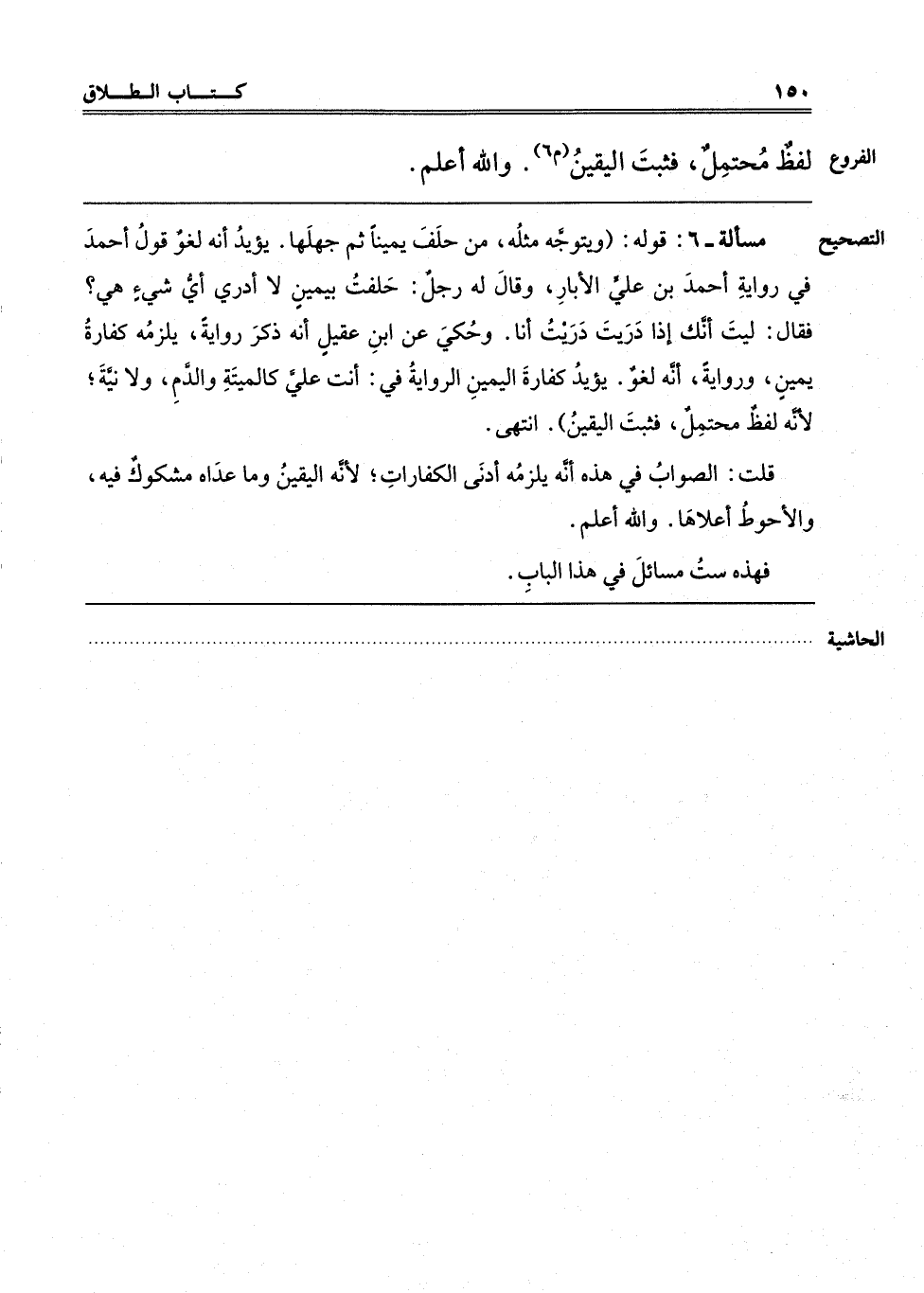 ـــــــــــــــــــــــــــــQمَسْأَلَةٌ 6: قَوْلُهُ: وَيُتَوَجَّهُ مِثْلُهُ مَنْ حَلَفَ يَمِينًا ثُمَّ جَهِلَهَا يُؤَيِّدُ أَنَّهُ لَغْوٌ قَوْلُ أَحْمَدَ فِي رِوَايَةِ أَحْمَدَ بْنِ عَلِيٍّ الْأَبَّارِ وَقَالَ لَهُ رَجُلٌ: حَلَفْت بِيَمِينٍ لَا أَدْرِي أَيَّ شَيْءٍ هِيَ، فَقَالَ: لَيْتَ أَنَّك إذَا دَرَيْت دريت أنا، وحكى عن ابن عقيل أنه ذَكَرَ رِوَايَةً: يَلْزَمُهُ كَفَّارَةُ يَمِينٍ، وَرِوَايَةً أَنَّهُ لَغْوٌ، يُؤَيِّدُ كَفَّارَةَ الْيَمِينِ الرِّوَايَةُ فِي أَنْتِ عَلَيَّ كَالْمَيْتَةِ وَالدَّمِ، وَلَا نِيَّةَ، لِأَنَّهُ لَفْظٌ مُحْتَمَلٌ فَثَبَتَ الْيَقِينُ. انْتَهَى.