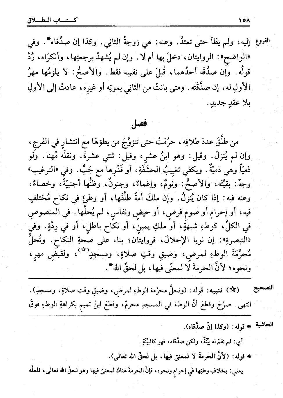 مَعَ انْتِشَارٍ فِي الْفَرْجِ وَإِنْ لَمْ يُنْزِلْ، وَقِيلَ: وَهُوَ ابن عشر، وقيل: ثنتي عشرة وَنَقَلَهُ مُهَنَّا وَلَوْ ذِمِّيًّا وَهِيَ ذِمِّيَّةٌ، وَيَكْفِي تَغْيِيبُ الْحَشَفَةِ أَوْ قَدْرِهَا مَعَ جَبٍّ. وَفِي التَّرْغِيبِ وَجْهٌ: بَقِيَّتُهُ، وَالْأَصَحُّ: وَنَوْمٌ وَإِغْمَاءٌ وَجُنُونٌ وَظَنَّهَا أَجْنَبِيَّةً وَخِصَاءٌ وَعَنْهُ فِيهِ: إذَا كَانَ يُنْزِلُ، وَإِنْ مَلَكَ أَمَةً طَلَّقَهَا أَوْ وَطِئَ فِي نِكَاحٍ مُخْتَلَفٍ فِيهِ أَوْ إحْرَامٍ أَوْ صَوْمِ فَرْضٍ أَوْ حَيْضٍ وَنِفَاسٍ لَمْ يُحِلَّهَا، فِي الْمَنْصُوصِ فِي الْكُلِّ، كَوَطْءِ شُبْهَةٍ أَوْ مِلْكِ يَمِينٍ أَوْ نِكَاحٍ بَاطِلٍ أَوْ فِي رِدَّةٍ. وَفِي التَّبْصِرَةِ: إنْ نَوَيَا الْإِحْلَالَ فَرِوَايَتَانِ، بِنَاءً عَلَى صِحَّةِ النِّكَاحِ. وَتَحِلُّ مُحَرَّمَةُ الْوَطْءِ لِمَرَضٍ وَضِيقِ وَقْتِ صَلَاةٍ وَمَسْجِدٍ وَلِقَبْضِ مَهْرٍ وَنَحْوِهِ؛ لِأَنَّ الْحُرْمَةَ لَا لِمَعْنًى فِيهَا بَلْ لحق الله