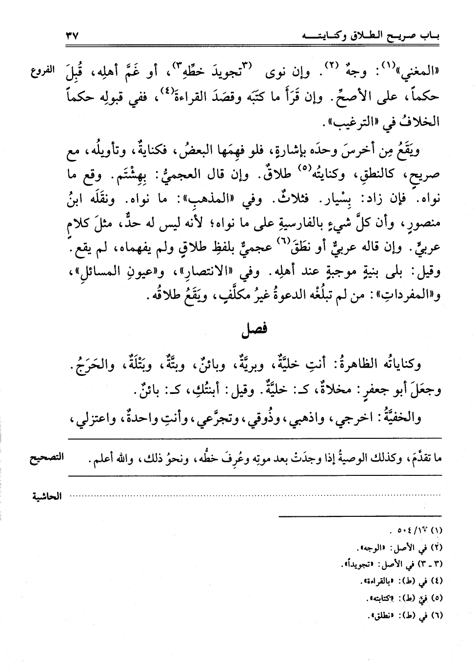 فصل وَكِنَايَاتُهُ الظَّاهِرَةُ: أَنْتِ خَلِيَّةٌ، وَبَرِيئَةٌ، وَبَائِنٌ، وَبَتَّةٌ، وبتلة، والحرج.