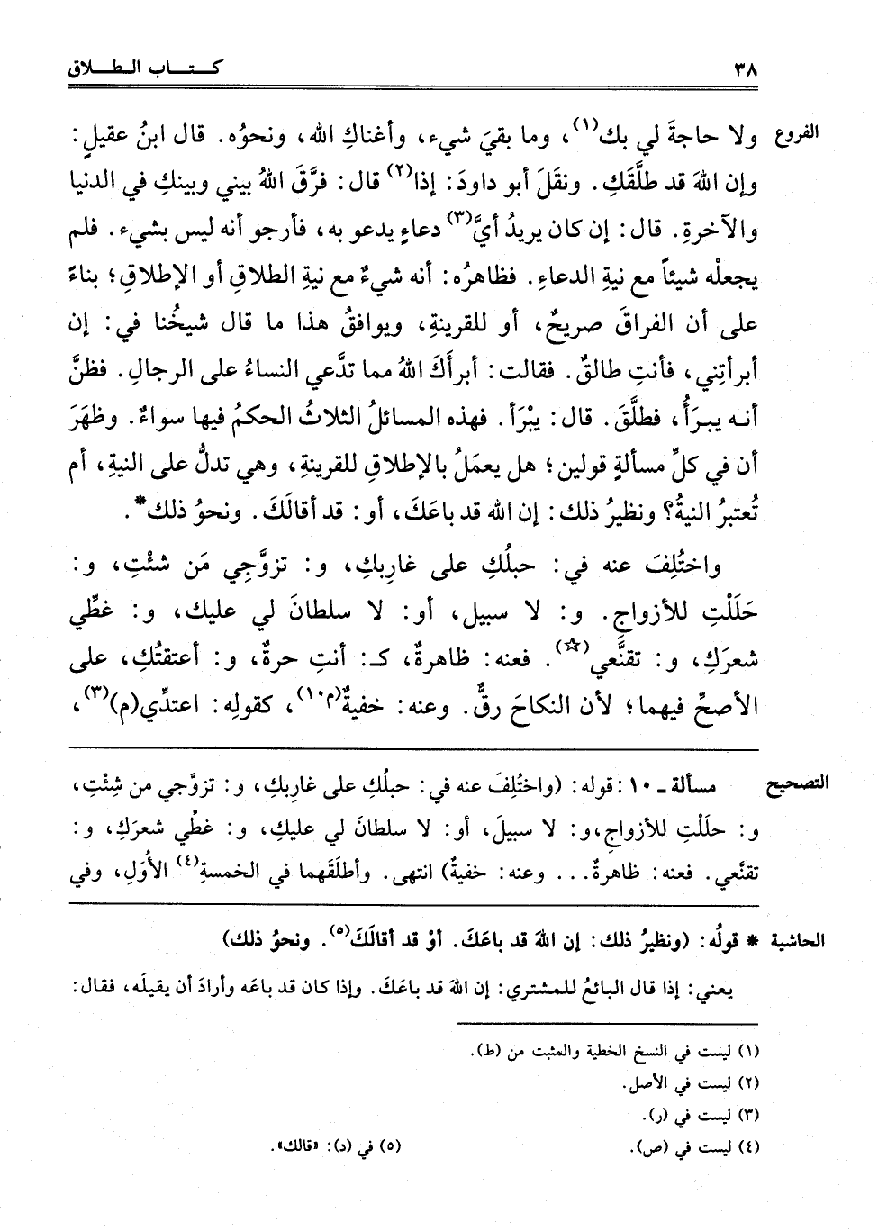 وَلَا حَاجَةَ لِي بِك1 وَمَا بَقِيَ شَيْءٌ، وَأَغْنَاك اللَّهُ، وَنَحْوَهُ، قَالَ ابْنُ عَقِيلٍ: وَإِنَّ اللَّهَ قَدْ طَلَّقَك، وَنَقَلَ أَبُو دَاوُد: إذَا2 قَالَ: فَرَّقَ اللَّهُ بَيْنِي وَبَيْنَك فِي الدُّنْيَا وَالْآخِرَةِ، قَالَ: إنْ كَانَ يُرِيدُ أَيْ3 دُعَاءً يَدْعُو بِهِ فَأَرْجُو أَنَّهُ لَيْسَ بِشَيْءٍ. فَلَمْ يَجْعَلْهُ شَيْئًا مَعَ نِيَّةِ الدُّعَاءِ، فَظَاهِرُهُ أَنَّهُ شَيْءٌ مَعَ نِيَّةِ الطَّلَاقِ أَوْ الْإِطْلَاقِ، بِنَاءً عَلَى أَنَّ الْفِرَاقَ صَرِيحٌ أَوْ لِلْقَرِينَةِ، وَيُوَافِقُ هَذَا مَا قَالَ شَيْخُنَا فِي إنْ أَبْرَأْتنِي فَأَنْتِ طَالِقٌ، فَقَالَتْ: أَبْرَأَك اللَّهُ، مِمَّا تَدَّعِي النِّسَاءُ عَلَى الرِّجَالِ، فَظَنَّ أَنَّهُ يَبْرَأُ فَطَلَّقَ قَالَ: يَبْرَأُ، فَهَذِهِ الْمَسَائِلُ الثَّلَاثُ الْحُكْمُ فِيهَا سَوَاءٌ، وَظَهَرَ أَنَّ فِي كُلِّ مَسْأَلَةٍ قَوْلَيْنِ: هَلْ يَعْمَلُ بِالْإِطْلَاقِ لِلْقَرِينَةِ وَهِيَ تَدُلُّ عَلَى النِّيَّةِ، أَمْ تُعْتَبَرُ النِّيَّةُ؟ وَنَظِيرُ ذَلِكَ: إنَّ اللَّهَ قَدْ بَاعَك، أَوْ قَدْ أَقَالَك وَنَحْوَ ذَلِكَ، وَاخْتَلَفَ عَنْهُ فِي: حَبْلُك عَلَى غَارِبِك، وَتَزَوَّجِي مَنْ شِئْت، وَحَلَلْت لِلْأَزْوَاجِ، وَلَا سَبِيلَ أَوْ لَا سُلْطَانَ لِي عَلَيْك، وَغَطِّي شَعْرَك وَتَقَنَّعِي، فَعَنْهُ ظَاهِرَةٌ، كَأَنْتِ حُرَّةٌ وَأَعْتَقْتُك، عَلَى الْأَصَحِّ فِيهِمَا، لِأَنَّ النِّكَاحَ رِقٌّ، وَعَنْهُ خَفِيَّةٌ م 10 كقوله: اعتدي م،
