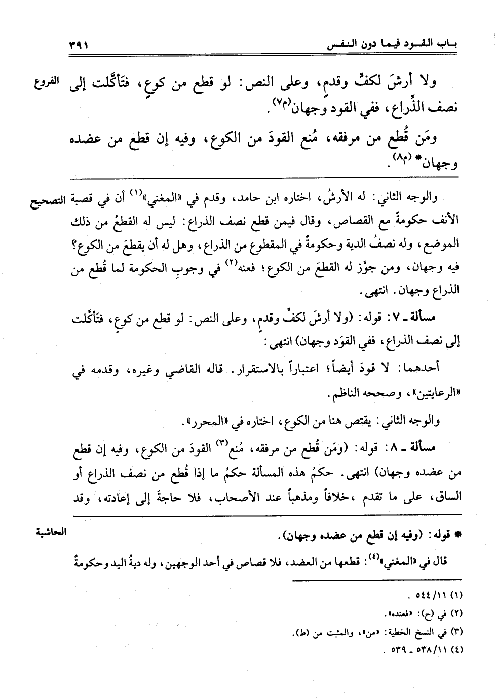 مَسْأَلَةٌ 8 قَوْلُهُ: وَمَنْ قُطِعَ مِنْ مَرْفِقِهِ مُنِعَ3 الْقَوَدَ مِنْ الْكُوعِ، وَفِيهِ إنْ قُطِعَ مِنْ عَضُدِهِ وَجْهَانِ، انْتَهَى. حُكْمُ هَذِهِ الْمَسْأَلَةِ حُكْمُ مَا إذَا قُطِعَ مِنْ نِصْفِ الذِّرَاعِ أَوْ السَّاقِ، عَلَى مَا تَقَدَّمَ خِلَافًا وَمَذْهَبًا عِنْدَ الْأَصْحَابِ، فَلَا حَاجَةَ إلَى إعَادَتِهِ، وقد
