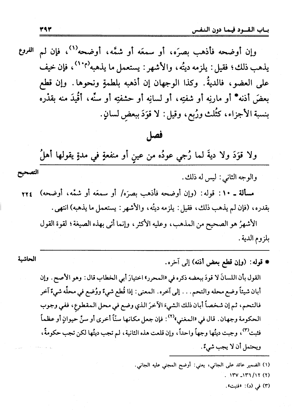 وإن أوضحه فأذهب بصره أو سمعه أو شَمَّهُ أَوْضَحَهُ1، فَإِنْ لَمْ يَذْهَبْ ذَلِكَ فَقِيلَ: يَلْزَمُهُ دِيَتُهُ، وَالْأَشْهَرُ: يَسْتَعْمِلُ مَا يُذْهِبُهُ م 10 فإن خيف على العضو فالدية، وكذا الْوَجْهَانِ إنْ أَذْهَبَهُ بِلَطْمَةٍ وَنَحْوِهَا، وَإِنْ قَطَعَ بَعْضَ أُذُنِهِ أَوْ مَارِنِهِ أَوْ شَفَتِهِ أَوْ لِسَانِهِ أَوْ حَشَفَتِهِ أَوْ سِنِّهِ أُقَيِّدُ مِنْهُ بِقَدْرِهِ بِنِسْبَةِ الْأَجْزَاءِ، كَثُلُثٍ وَرُبُعٍ، وَقِيلَ: لَا قود ببعض لسان.