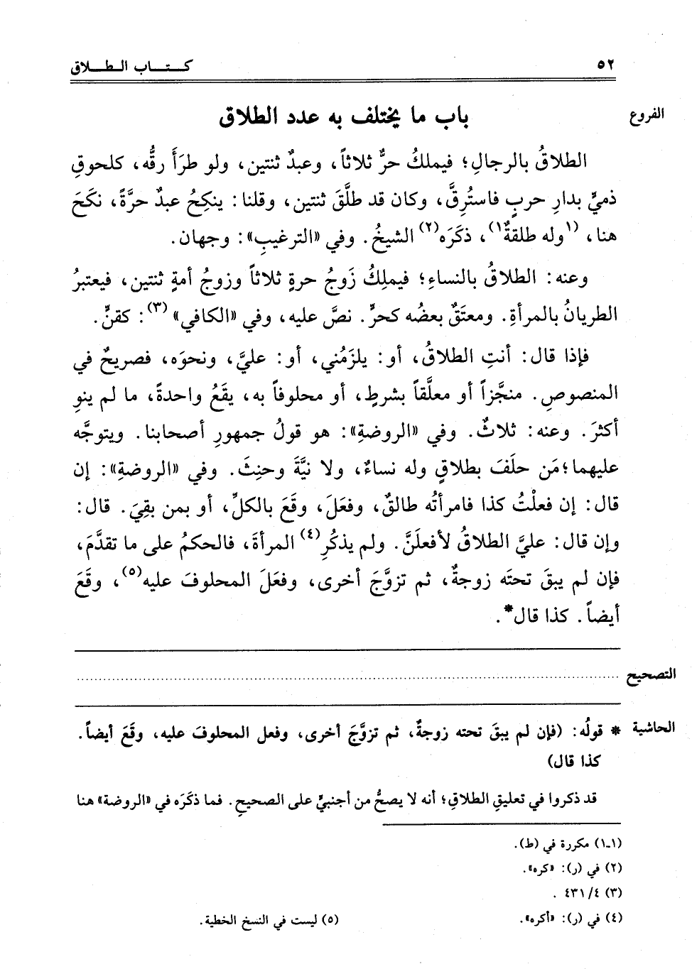 وَعَنْهُ: الطَّلَاقُ بِالنِّسَاءِ، فَيَمْلِكُ زَوْجُ حُرَّةٍ ثَلَاثًا، وَزَوْجُ أَمَةٍ ثِنْتَيْنِ، فَيُعْتَبَرُ الطَّرَيَانِ بِالْمَرْأَةِ. وَمُعْتَقُ بَعْضُهُ كَحُرٍّ، نَصَّ عَلَيْهِ، وَفِي الْكَافِي3: كَقِنٍّ.