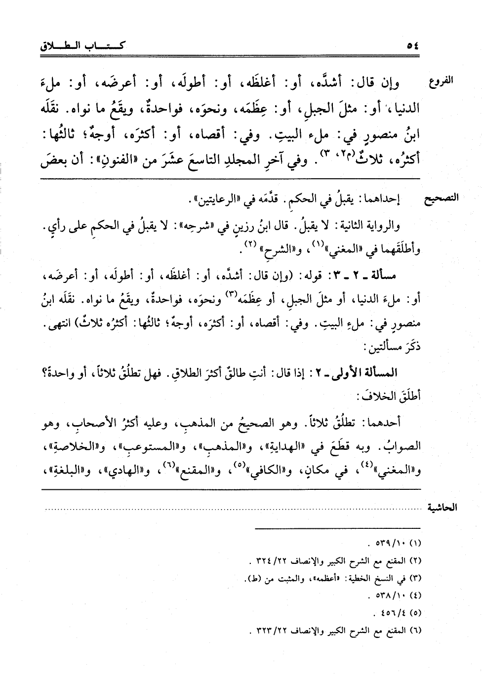 وَإِنْ قَالَ: أَشَدَّهُ أَوْ أَغْلَظَهُ أَوْ أَطْوَلَهُ أَوْ أَعْرَضَهُ أَوْ مِلْءَ الدُّنْيَا أَوْ مِثْلَ الْجَبَلِ أَوْ عِظَمَهُ وَنَحْوَهُ فَوَاحِدَةٌ. وَيَقَعُ مَا نَوَاهُ، نَقَلَهُ ابْنُ مَنْصُورٍ فِي مِلْءِ الْبَيْتِ، وَفِي أَقْصَاهُ أَوْ أَكْثَرِهِ أَوْجُهٌ، ثَالِثُهَا: أَكْثَرُهُ ثَلَاثٌ م 2 و 3 وَفِي آخِرِ الْمُجَلَّدِ التَّاسِعَ عشر من الفنون: أن بعض