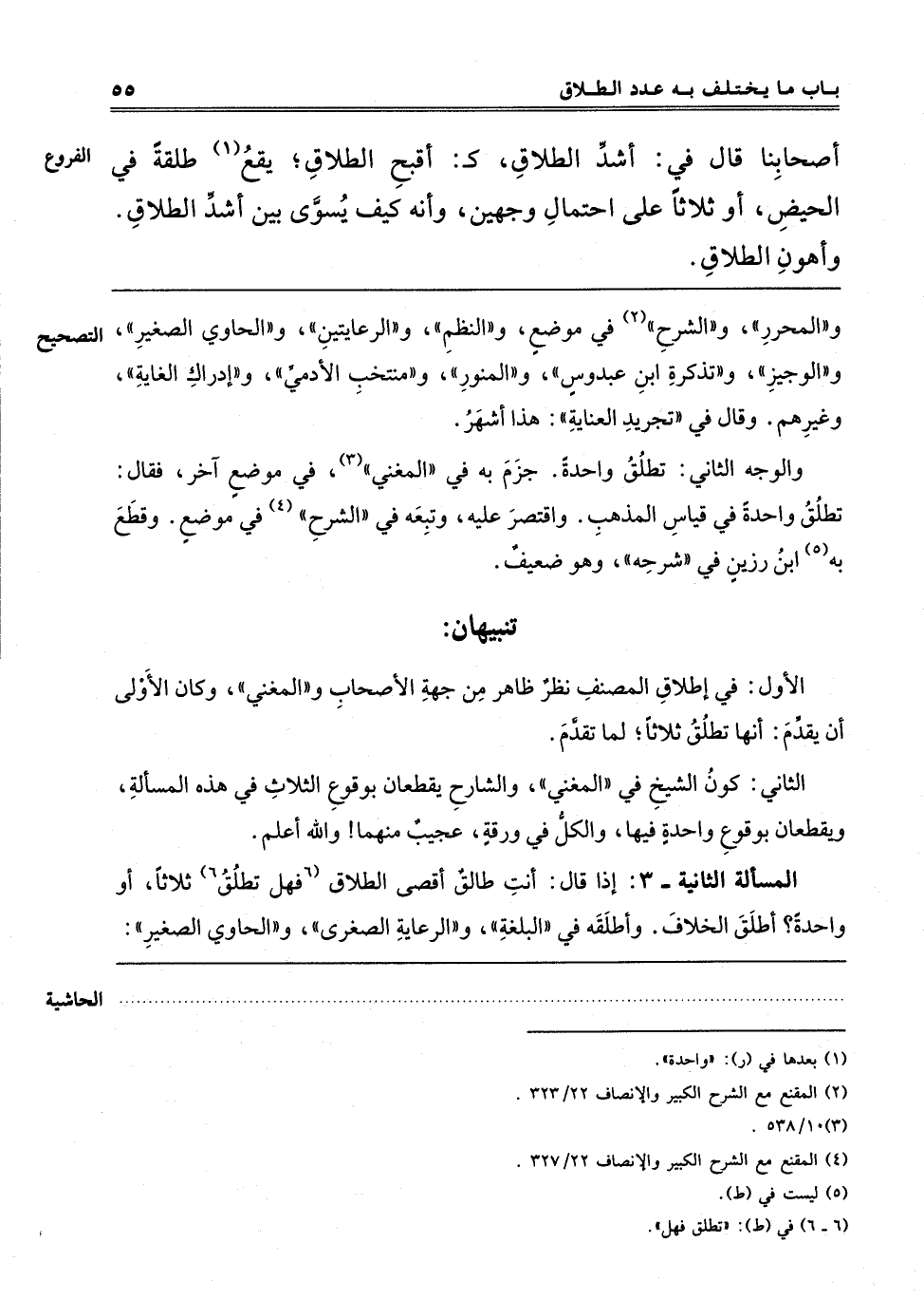 أَصْحَابِنَا قَالَ فِي أَشَدِّ الطَّلَاقِ كَأَقْبَحِ الطَّلَاقِ يقع1 طلقة في الْحَيْضِ أَوْ ثَلَاثٌ، عَلَى احْتِمَالِ وَجْهَيْنِ، وَأَنَّهُ كَيْفَ يُسَوِّي بَيْنَ أَشَدِّ الطَّلَاقِ وَأَهْوَنِ الطَّلَاقِ.