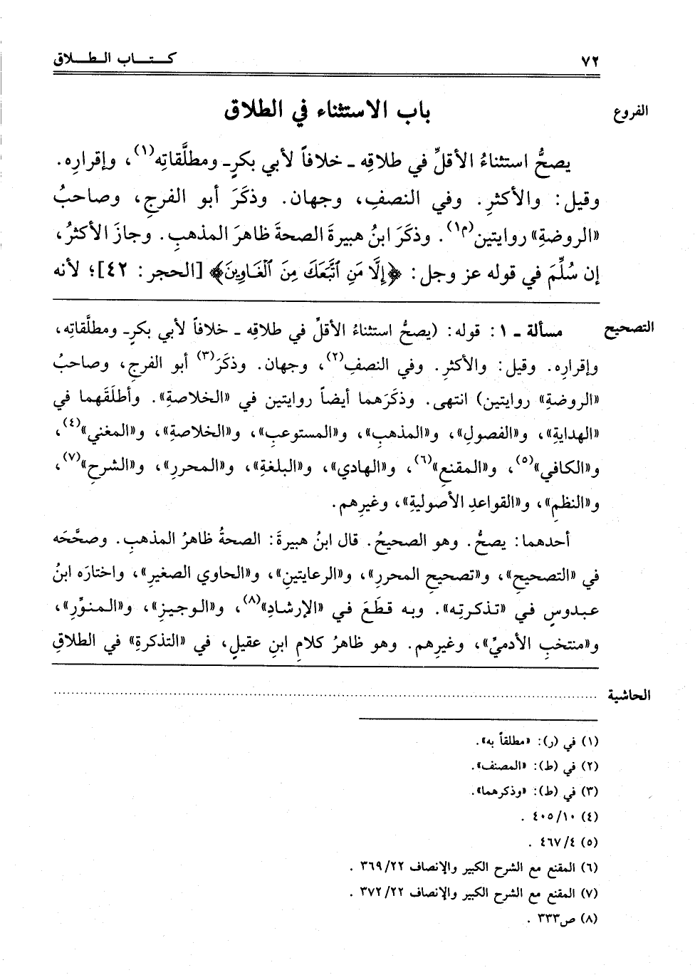 ـــــــــــــــــــــــــــــQمَسْأَلَةٌ 1: قَوْلُهُ: يَصِحُّ اسْتِثْنَاءُ الْأَقَلِّ فِي طَلَاقِهِ. خِلَافًا لِأَبِي بَكْرٍ وَمُطْلَقَاتِهِ وَإِقْرَارِهِ، وَقِيلَ: وَالْأَكْثَرُ، وَفِي النِّصْفِ2 وَجْهَانِ، وَذَكَرَ3 أَبُو الْفَرَجِ وَصَاحِبُ الرَّوْضَةِ رِوَايَتَيْنِ، انْتَهَى وَذَكَرَهُمَا أَيْضًا رِوَايَتَيْنِ فِي الْخُلَاصَةِ، وَأَطْلَقَهُمَا فِي الْهِدَايَةِ وَالْفُصُولِ وَالْمُذْهَبِ وَالْمُسْتَوْعِبِ وَالْخُلَاصَةِ وَالْمُغْنِي4 وَالْكَافِي5 وَالْمُقْنِعِ6 وَالْهَادِي وَالْبُلْغَةِ وَالْمُحَرَّرِ وَالشَّرْحِ7 وَالنَّظْمِ وَالْقَوَاعِدِ الْأُصُولِيَّةِ وَغَيْرِهِمْ.