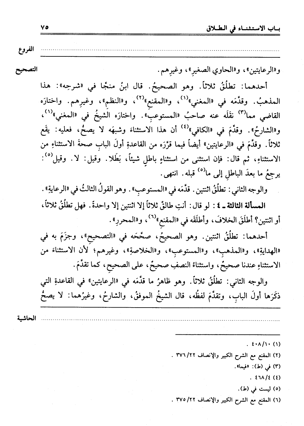 ـــــــــــــــــــــــــــــQوَالرِّعَايَتَيْنِ وَالْحَاوِي الصَّغِيرِ وَغَيْرِهِمْ. أَحَدُهُمَا: تَطْلُقُ ثَلَاثًا، وهو الصحيح، قال ابن منجا فِي شَرْحِهِ: هَذَا الْمَذْهَبَ، وَقَدَّمَهُ فِي الْمُغْنِي1 والمقنع2 والنظم وغيرهم، واختاره القاضي مما3 نَقَلَهُ عَنْهُ صَاحِبُ الْمُسْتَوْعِبِ، وَاخْتَارَهُ الشَّيْخُ فِي الْمُغْنِي وَالشَّارِحُ، وَقَدَّمَ فِي الْكَافِي4 أَنَّ هَذَا الِاسْتِثْنَاءَ وَشَبَهَهُ لَا يَصِحُّ، فَعَلَيْهِ يَقَعُ ثَلَاثًا، وَقَدَّمَ فِي الرِّعَايَتَيْنِ أَيْضًا فِيمَا قَرَّرَهُ مِنْ الْقَاعِدَةِ أَوَّلَ الْبَابِ صِحَّةَ الِاسْتِثْنَاءِ مِنْ الِاسْتِثْنَاءِ، ثُمَّ قَالَ: فَإِنْ اسْتَثْنَى مِنْ اسْتِثْنَاءٍ بَاطِلٍ شَيْئًا بَطَلَا، وَقِيلَ: لَا، وَقِيلَ: لَا يَرْجِعُ مَا بَعْدَ الْبَاطِلِ إلَى مَا5 قَبْلَهُ، انْتَهَى.