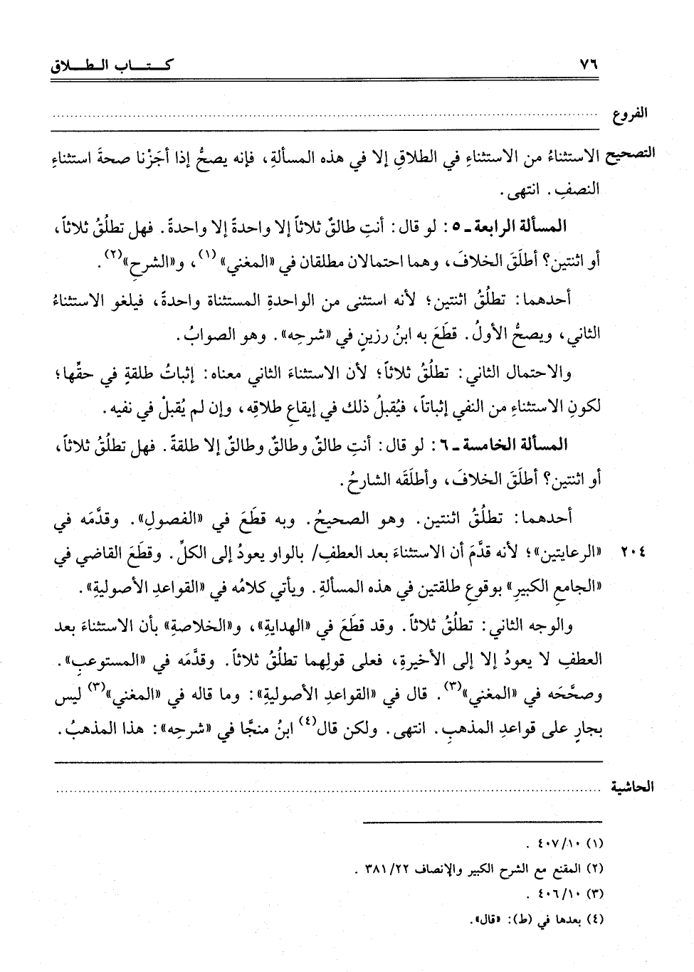وَالْوَجْهُ الثَّانِي: تَطْلُقُ ثَلَاثًا، وَقَدْ قَطَعَ فِي الْهِدَايَةِ وَالْخُلَاصَةِ بِأَنَّ الِاسْتِثْنَاءَ بَعْدَ الْعَطْفِ لَا يَعُودُ إلَّا إلَى الْأَخِيرَةِ، فَعَلَى قَوْلِهِمَا تَطْلُقُ ثَلَاثًا، وَقَدَّمَهُ فِي الْمُسْتَوْعِبِ، وَصَحَّحَهُ فِي الْمُغْنِي. قَالَ فِي الْقَوَاعِدِ الْأُصُولِيَّةِ: وَمَا قَالَهُ فِي الْمُغْنِي3 لَيْسَ بِجَارٍ عَلَى قَوَاعِدِ الْمَذْهَبِ، انْتَهَى. ولكن قال4 ابن منجا في شرحه: هذا المذهب.