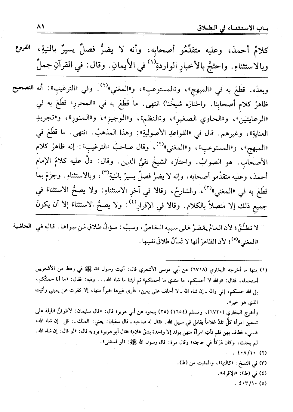 ـــــــــــــــــــــــــــــQوَبَعْدَهُ، قَطَعَ بِهِ فِي الْمُبْهِجِ وَالْمُسْتَوْعِبِ وَالْمُغْنِي2. وَفِي التَّرْغِيبِ أَنَّهُ ظَاهِرُ كَلَامِ أَصْحَابِنَا، وَاخْتَارَهُ شَيْخُنَا، انْتَهَى، مَا قَطَعَ بِهِ فِي الْمُحَرَّرِ قَطَعَ بِهِ فِي الرِّعَايَتَيْنِ وَالْحَاوِي الصَّغِيرِ وَالنَّظْمِ وَالْوَجِيزِ وَالْمُنَوِّرِ وَتَجْرِيدِ الْعِنَايَةِ وَغَيْرِهِمْ، قَالَ فِي الْقَوَاعِدِ الْأُصُولِيَّةِ: وَهَذَا الْمَذْهَبُ، انْتَهَى، مَا قَطَعَ بِهِ فِي الْمُبْهِجِ وَالْمُسْتَوْعِبِ وَالْمُغْنِي. وَقَالَ صَاحِبُ التَّرْغِيبِ: إنَّهُ ظَاهِرُ كَلَامِ الْأَصْحَابِ، وَهُوَ الصَّوَابُ، وَاخْتَارَهُ الشَّيْخُ تَقِيُّ الدِّينِ وَقَالَ: دَلَّ عَلَيْهِ كَلَامُ الْإِمَامِ أَحْمَدَ، وَعَلَيْهِ مُتَقَدِّمُو أَصْحَابِهِ، وَإِنَّهُ لَا يَضُرُّ فَصْلٌ يَسِيرٌ بِالنِّيَّةِ3 وَبِالِاسْتِثْنَاءِ وَجَزَمَ بِمَا قَطَعَ بِهِ فِي الْمُغْنِي وَالشَّارِحُ وَقَالَا فِي آخِرِ الِاسْتِثْنَاءِ وَلَا يَصِحُّ الِاسْتِثْنَاءُ فِي جَمِيعِ ذَلِكَ إلَّا مُتَّصِلًا بِالْكَلَامِ، وَقَالَا فِي الْإِقْرَارِ4: وَلَا يَصِحُّ الِاسْتِثْنَاءُ إلَّا أَنْ يَكُونَ