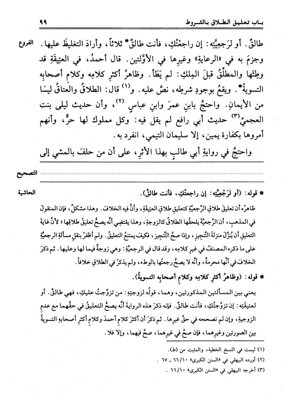 طَالِقٌ، أَوْ قَالَ لِرَجْعِيَّتِهِ إنْ رَاجَعْتُك فَأَنْتِ طَالِقٌ ثَلَاثًا، وَأَرَادَ التَّغْلِيظَ عَلَيْهَا. وَجَزَمَ بِهِ فِي الرِّعَايَةِ وَغَيْرِهَا فِي الْأُولَيَيْنِ، قَالَ أَحْمَدُ فِي الْعَتِيقَةِ قَدْ وَطِئَهَا وَالْمُطَلِّقُ قَبْلَ الْمِلْكِ لَمْ يَطَأْ. وَظَاهِرُ أَكْثَرِ كَلَامِهِ وَكَلَامِ أَصْحَابِهِ التسوية، ويقع بوجود شرطه، نص عليه. و1قال: الطَّلَاقُ وَالْعَتَاقُ لَيْسَا مِنْ الْأَيْمَانِ وَاحْتَجَّ بِابْنِ عُمَرَ وَابْنِ عَبَّاسٍ2، وَأَنَّ حَدِيثَ لَيْلَى بِنْتِ الْعَجَمِيِّ3 حَدِيثَ أَبِي رَافِعٍ لَمْ يَقُلْ فِيهِ: وَكُلُّ مَمْلُوكٍ لَهَا حُرٌّ، وَأَنَّهُمْ أَمَرُوهَا بِكَفَّارَةِ يَمِينٍ، إلَّا سُلَيْمَانُ التَّيْمِيُّ، انْفَرَدَ بِهِ.