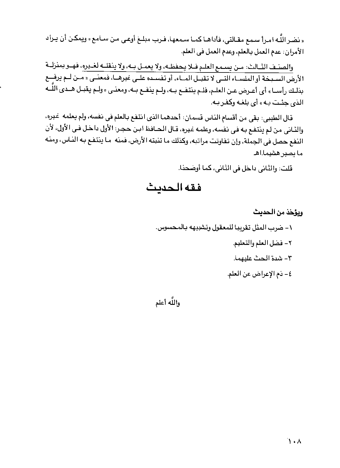 قال الطيبي: بقي من أقسام الناس قسمان: أحدهما الذي انتفع بالعلم في نفسه، ولم يعلمه غيره، والثاني من لم ينتفع به في نفسه، وعلمه غيره، قال الحافظ ابن حجر: الأول داخل في الأول، لأن النفع حصل في الجملة، وإن تفاوتت مراتبه، وكذلك ما تنبته الأرض، فمنه ما ينتفع به الناس، ومنه ما يصير هشيما. اهـ.